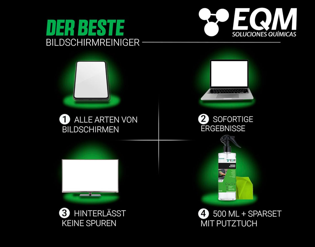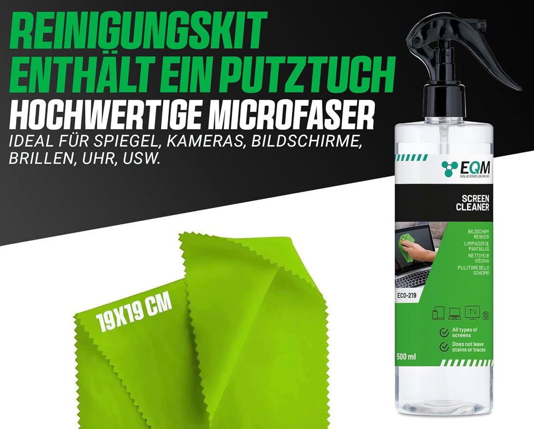 Bildschirmreiniger + Mikrofasertuch - 500 ML - Display Reiniger für Tablet, Handy, Laptop, Kamera, TV Displays (LED, OLED, QLED, TFT, LCD) - Entfernt Fettflecken und Fingerabdrücke