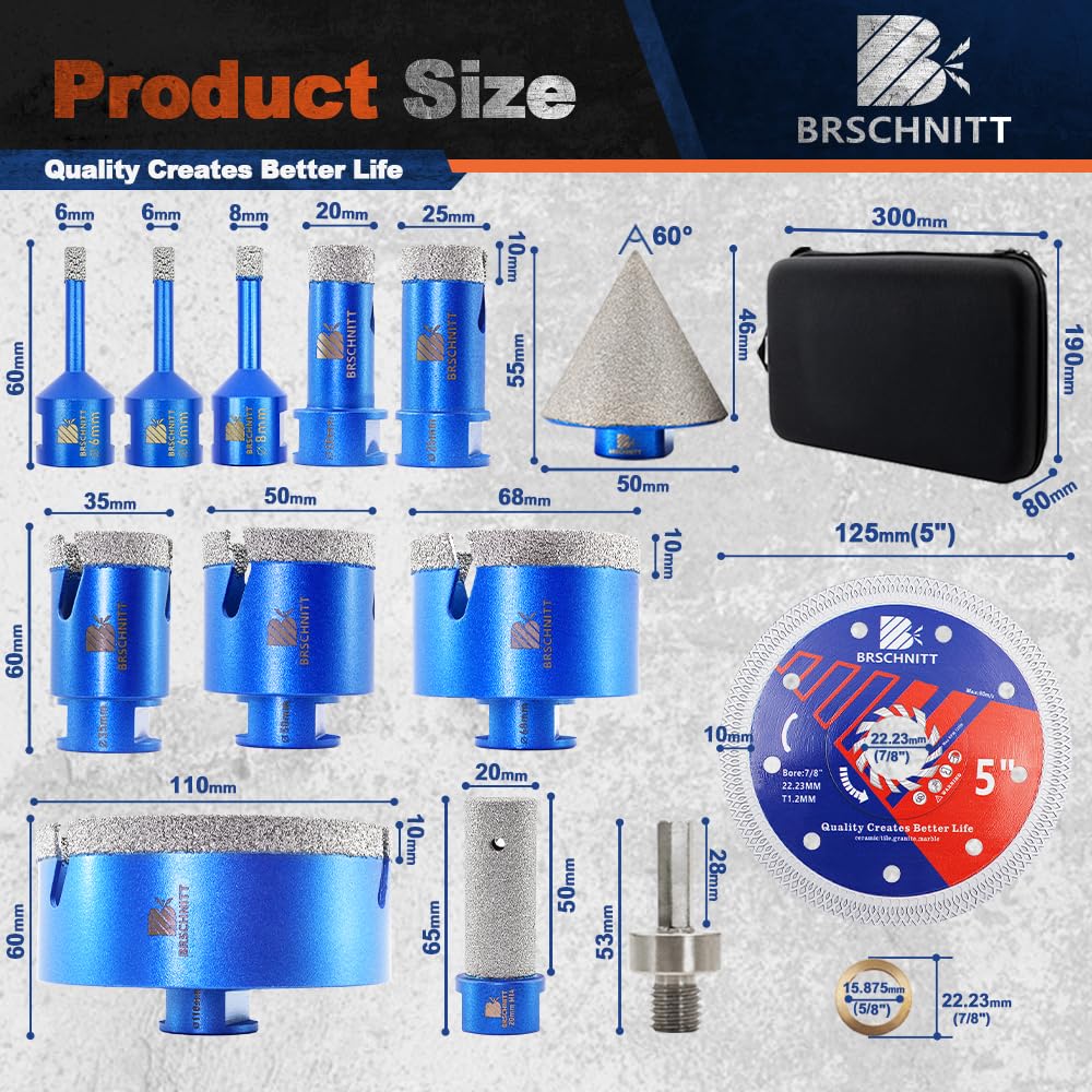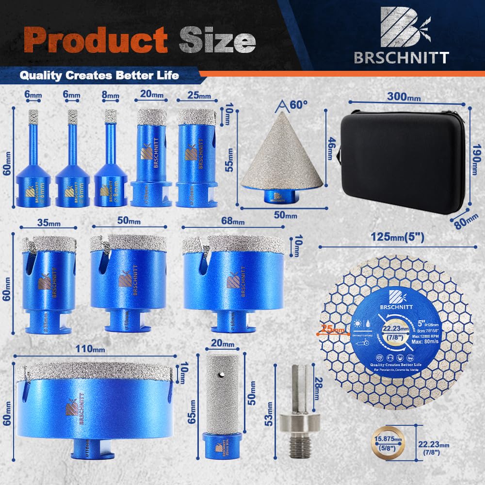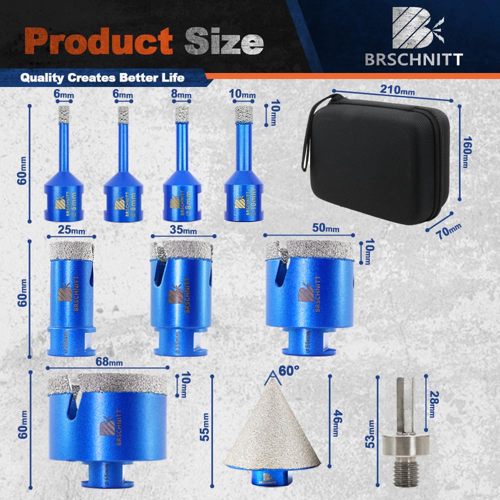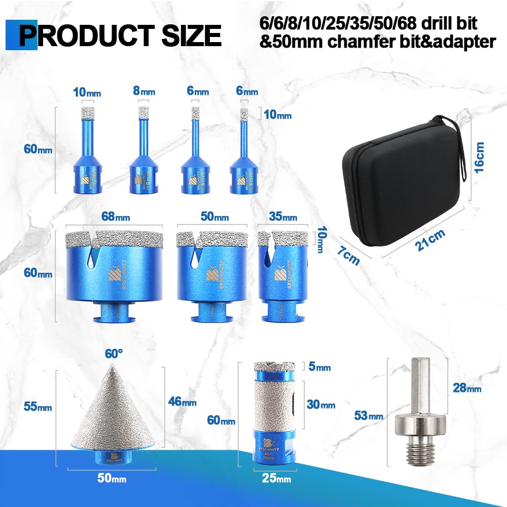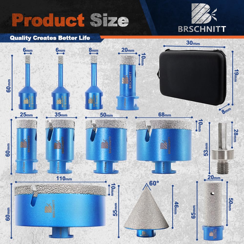 BRSCHNITT Diamantbohrer Fliesenbohrer Set -6/6/8/20/25/35/50/68/110 Diamantbohrer& 20mm Diamant Fingerfräser 50mm Fasenbohrer Adapter Keramik, Granit, Porzellan, Fliesen, Feinsteinzeug,Mauerwer