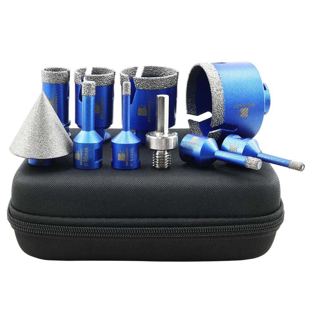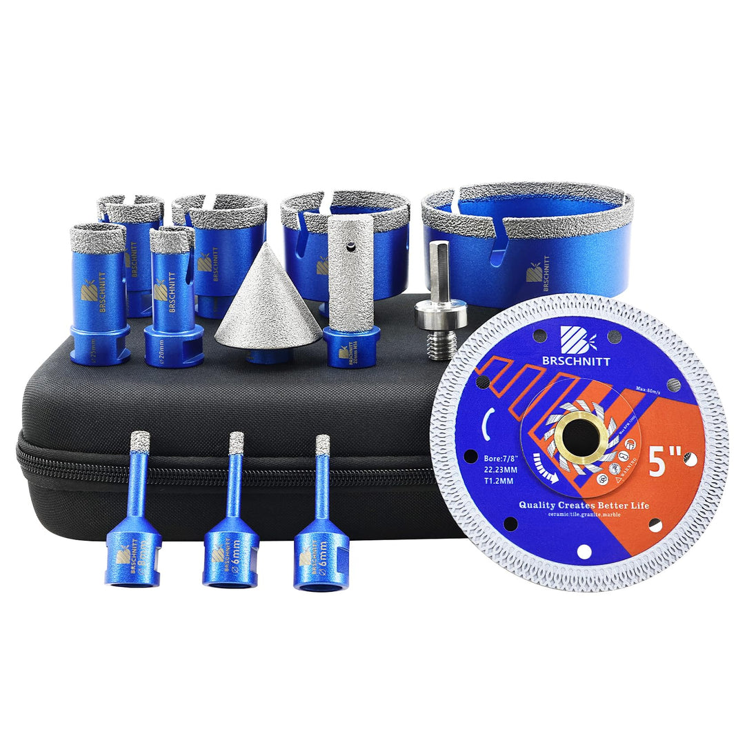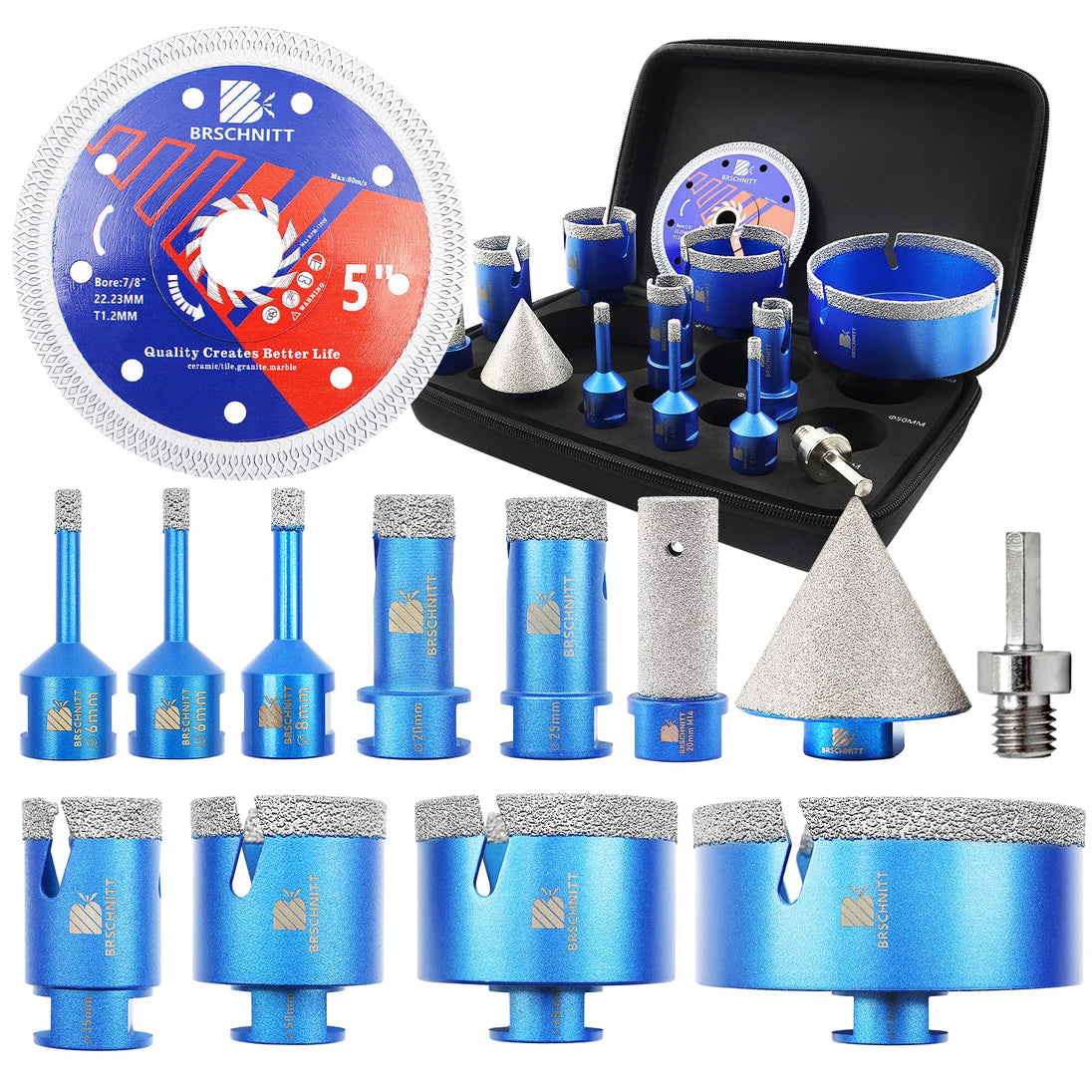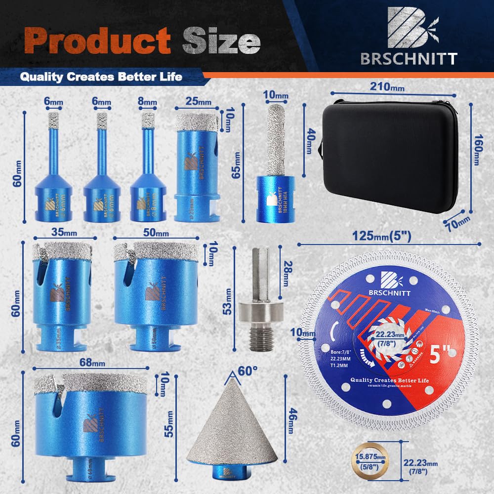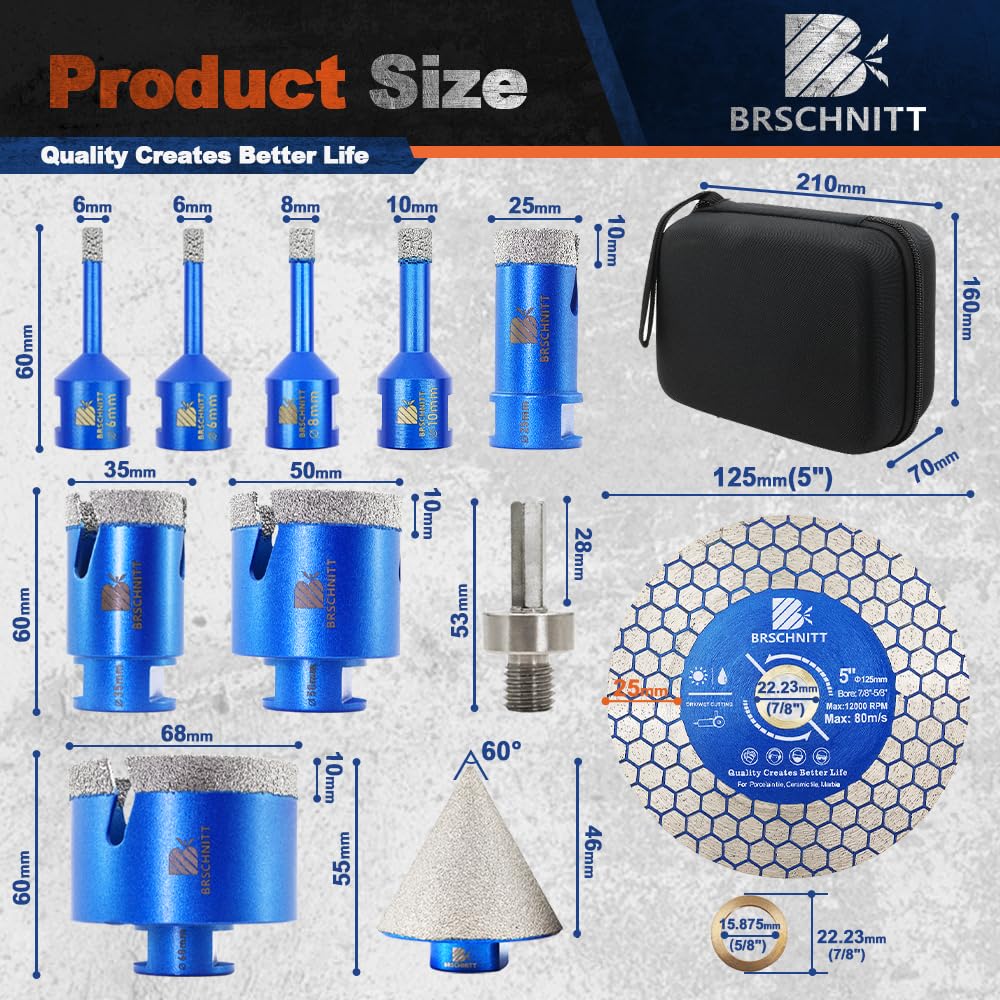 BRSCHNITT Diamantbohrer Fliesenbohrer Set -6/6/8/20/25/35/50/68/110 Diamantbohrer& 20mm Diamant Fingerfräser 50mm Fasenbohrer Adapter Keramik, Granit, Porzellan, Fliesen, Feinsteinzeug,Mauerwer