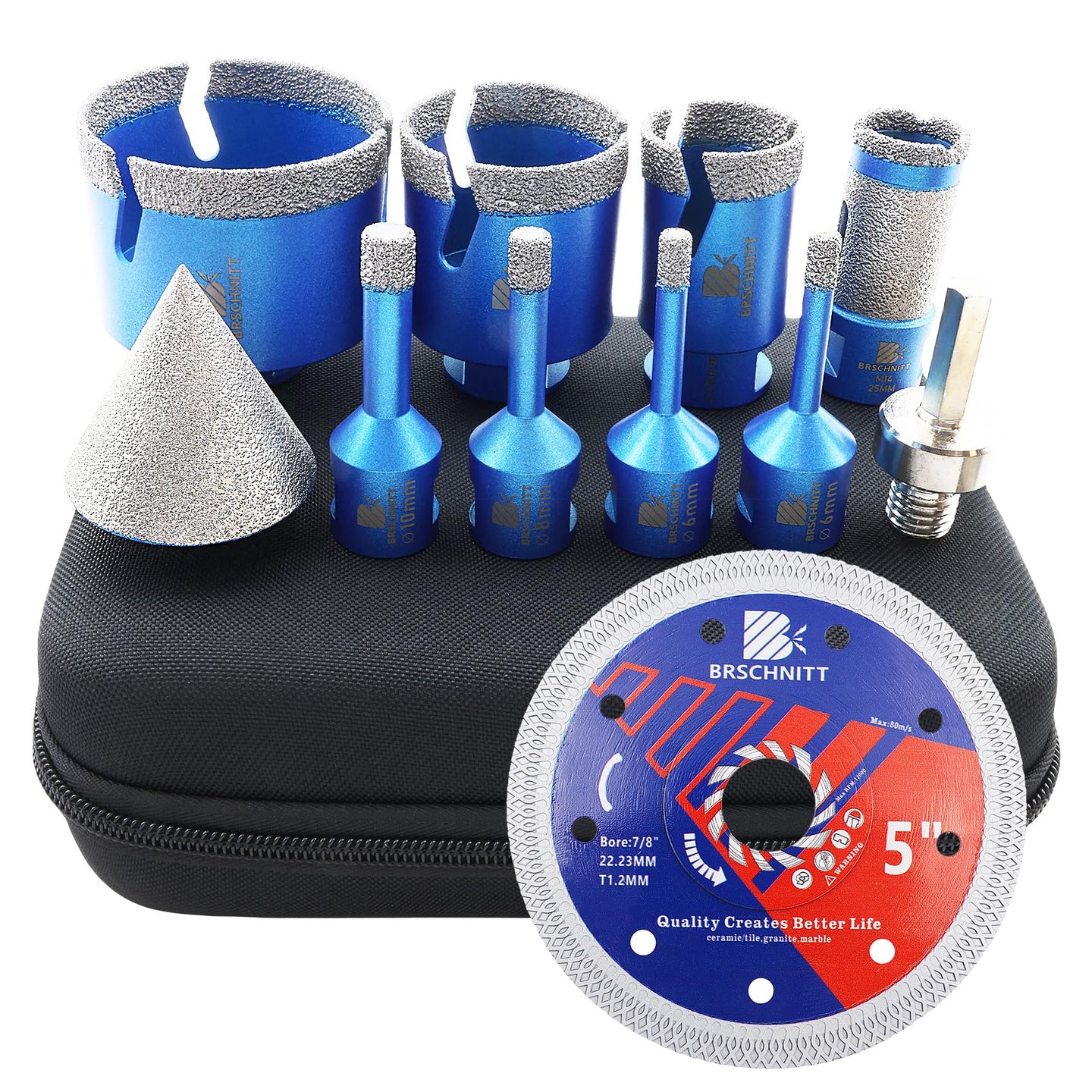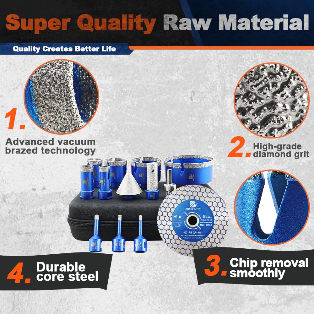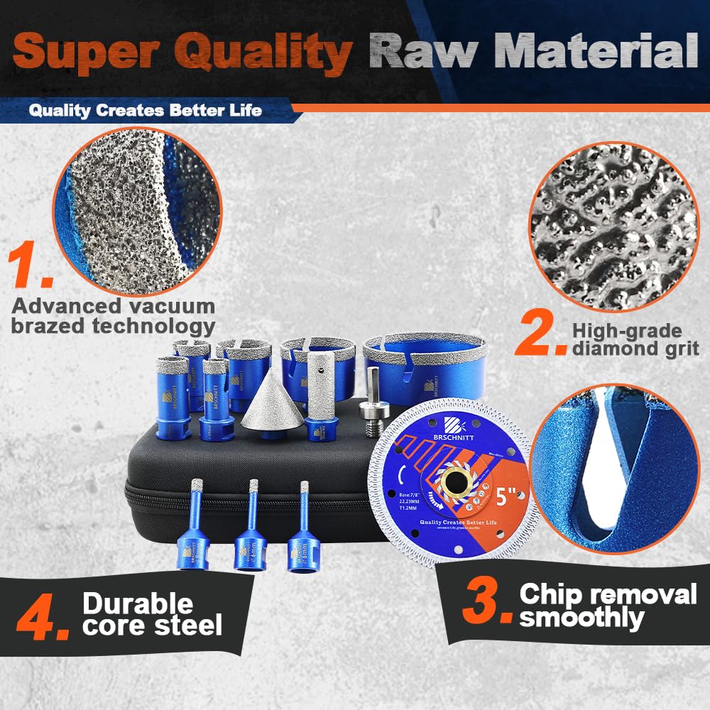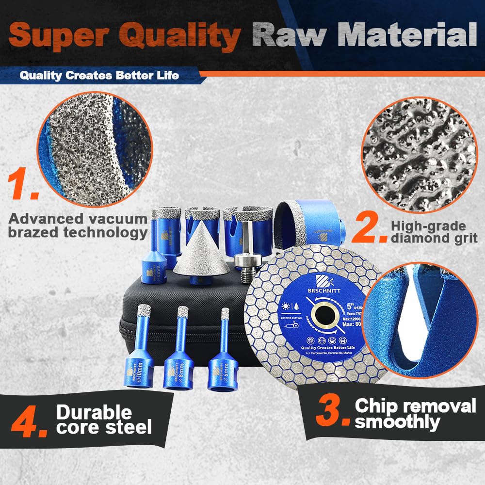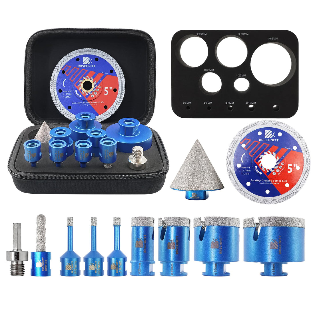 BRSCHNITT Diamantbohrer Fliesenbohrer Set -6/6/8/20/25/35/50/68/110 Diamantbohrer& 20mm Diamant Fingerfräser 50mm Fasenbohrer Adapter Keramik, Granit, Porzellan, Fliesen, Feinsteinzeug,Mauerwer