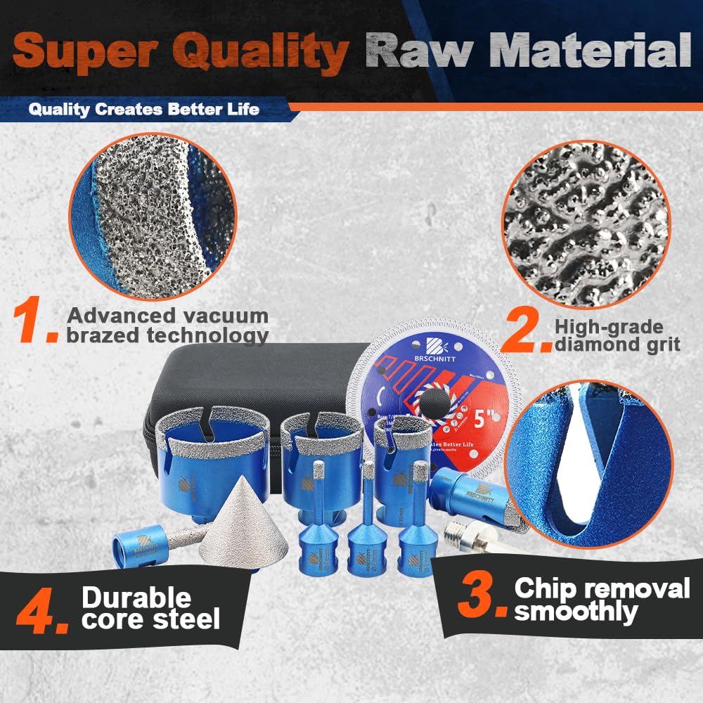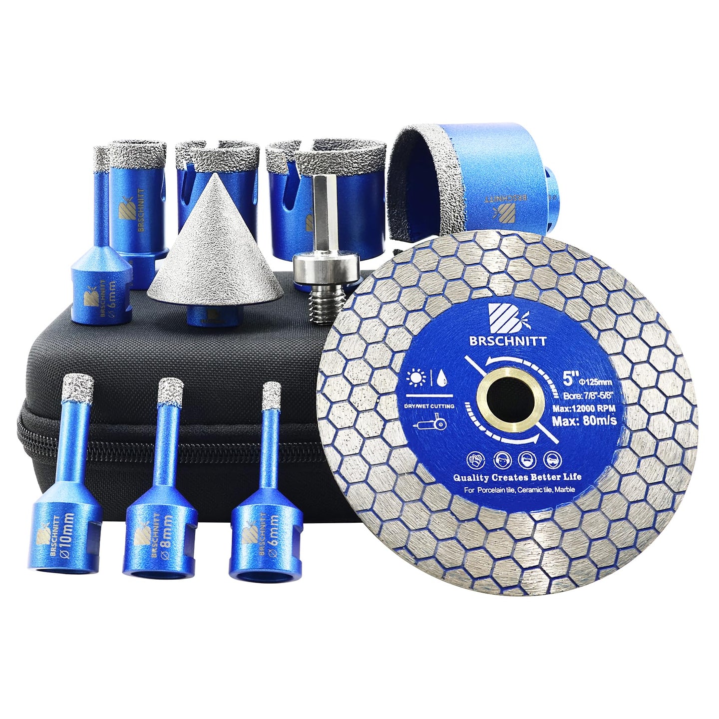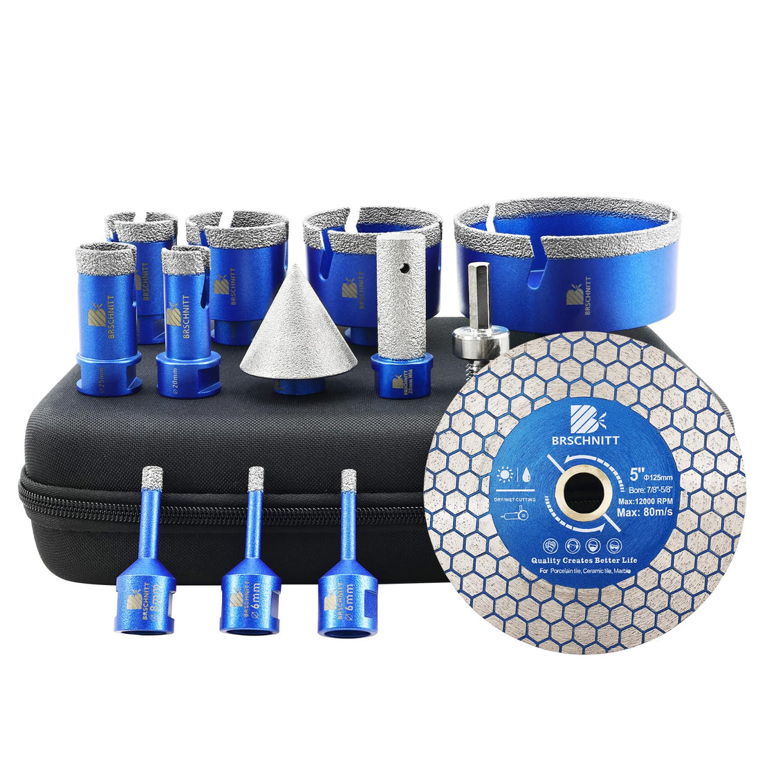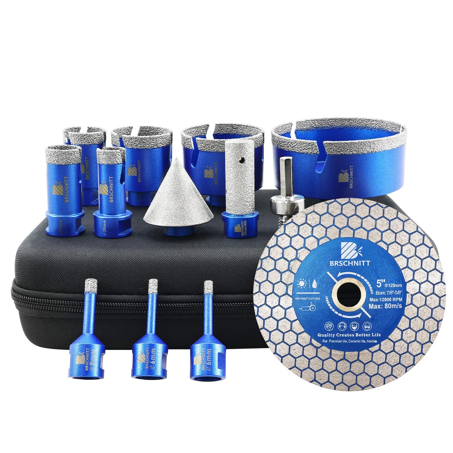 BRSCHNITT Diamantbohrer Fliesenbohrer Set -6/6/8/20/25/35/50/68/110 Diamantbohrer& 20mm Diamant Fingerfräser 50mm Fasenbohrer Adapter Keramik, Granit, Porzellan, Fliesen, Feinsteinzeug,Mauerwer