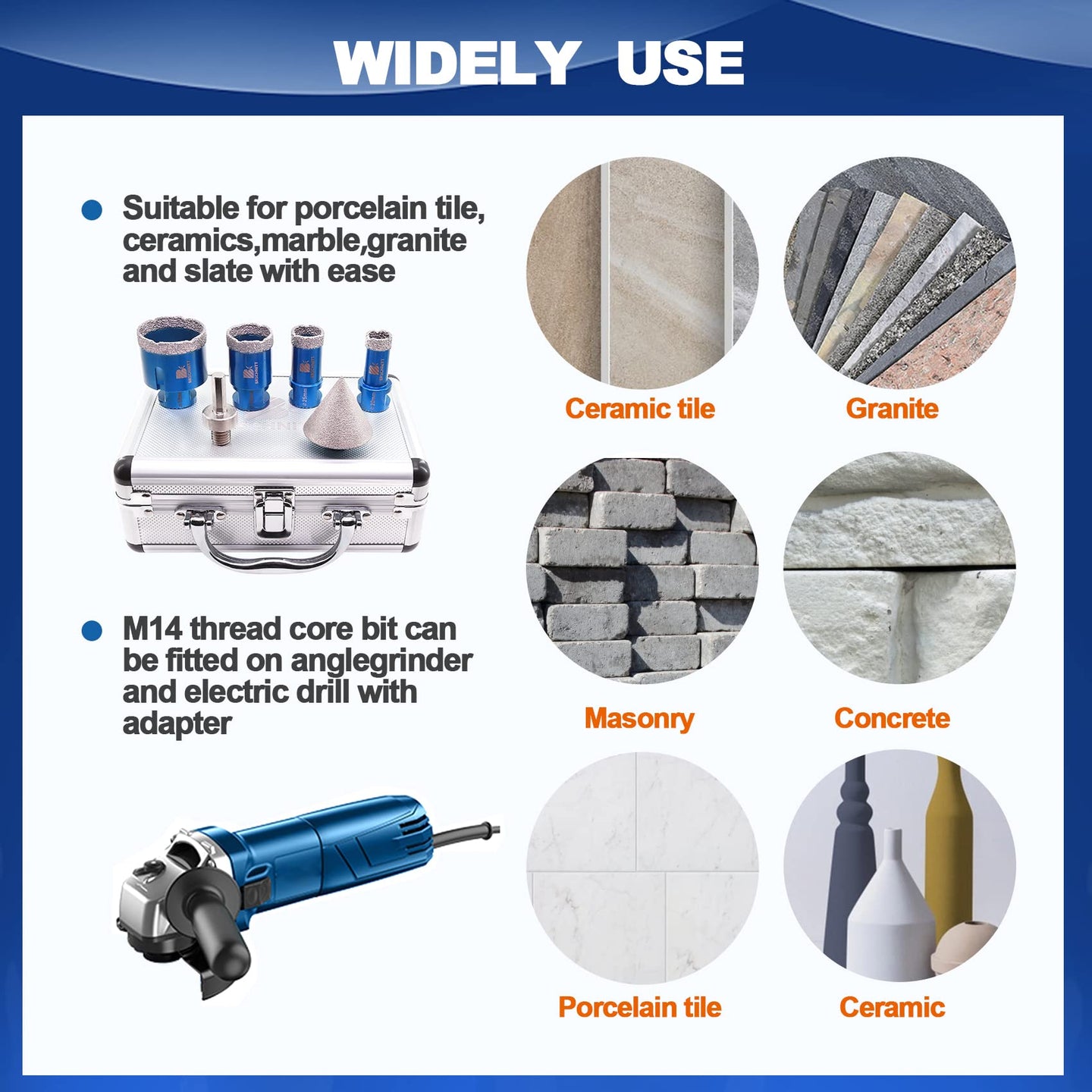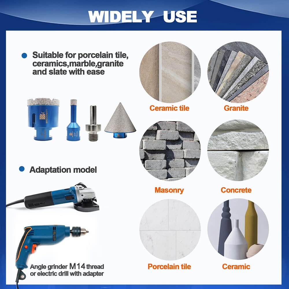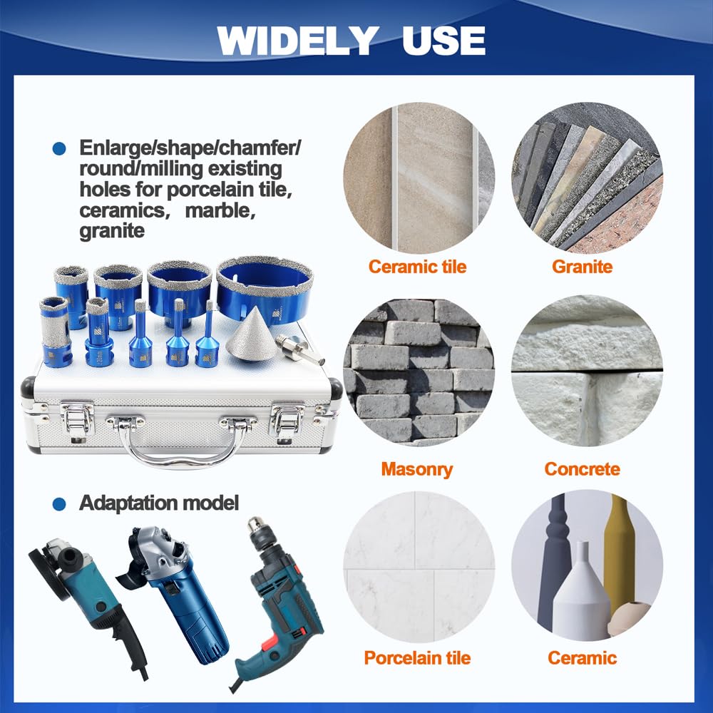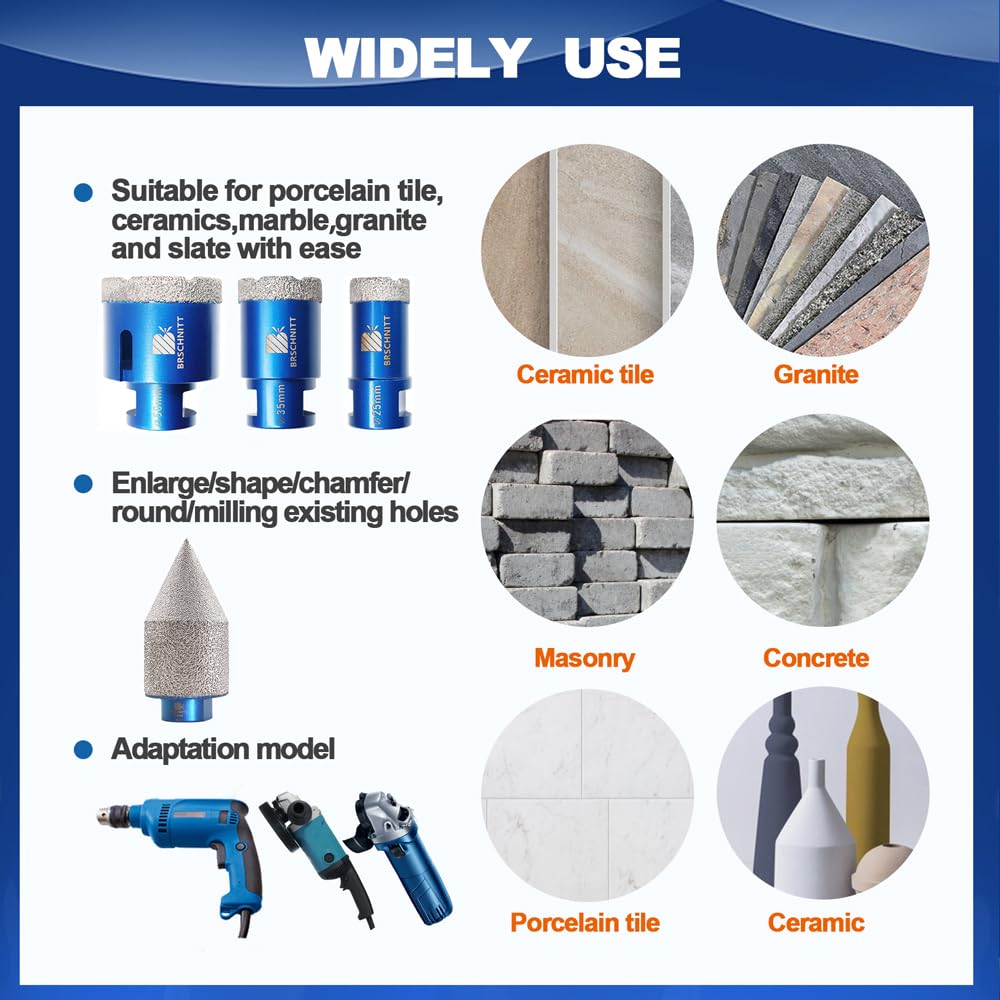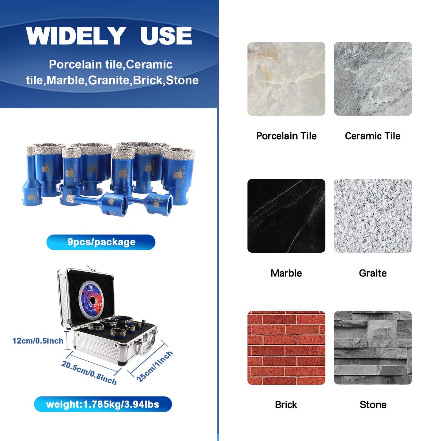 - ✔Breite Anwendung des Bohrers – Funktioniert hervorragend für Porzellanfliesen, Keramik, Badezimmerfliesen, Marmor, Granit, Stein, Mauerwerk und Ziegel. Die Verwendung von Wasser kann die Lebensdauer verlängern