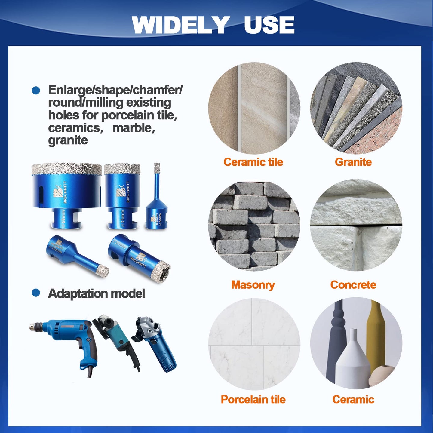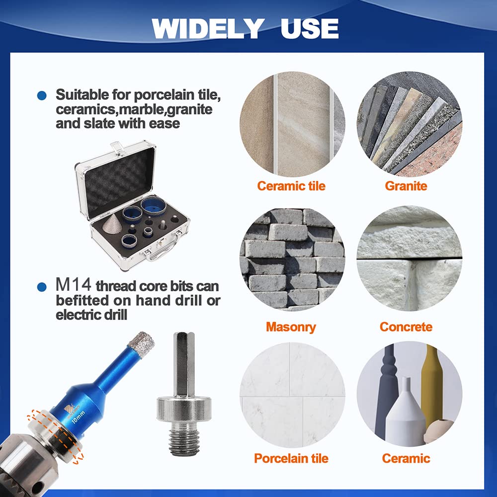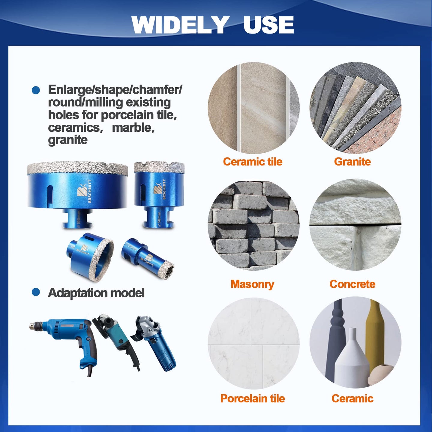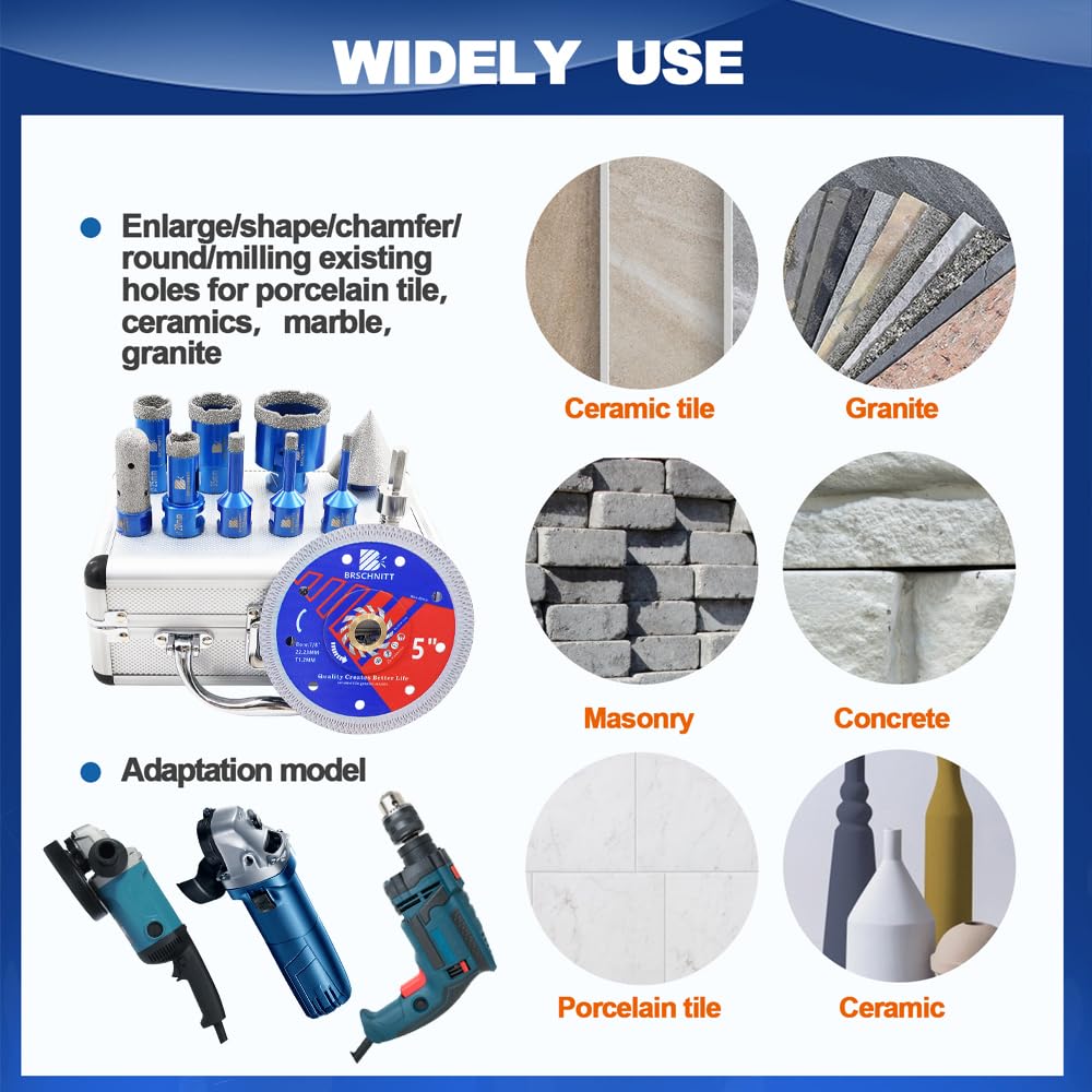 - ✔Breite Anwendung des Bohrers – Funktioniert hervorragend für Porzellanfliesen, Keramik, Badezimmerfliesen, Marmor, Granit, Stein, Mauerwerk und Ziegel. Die Verwendung von Wasser kann die Lebensdauer verlängern