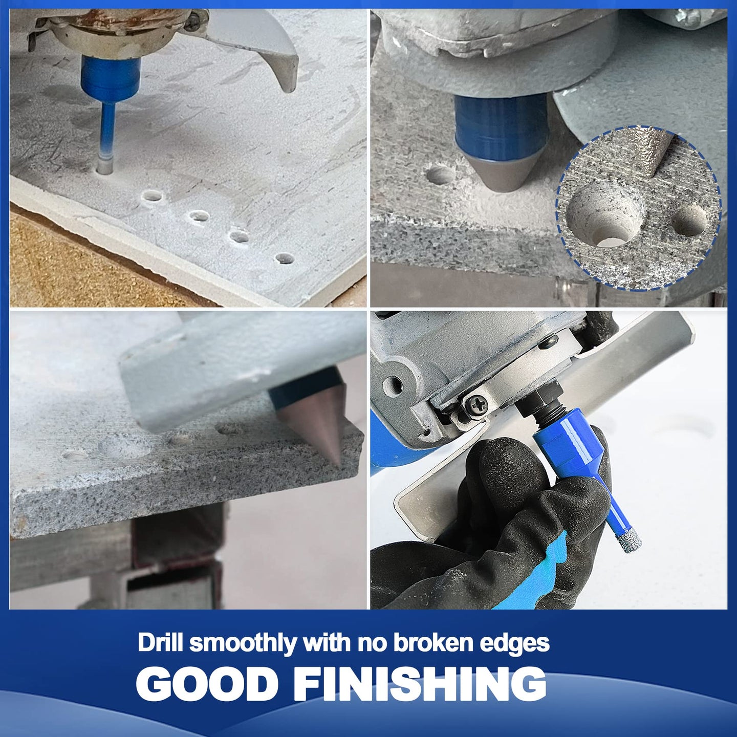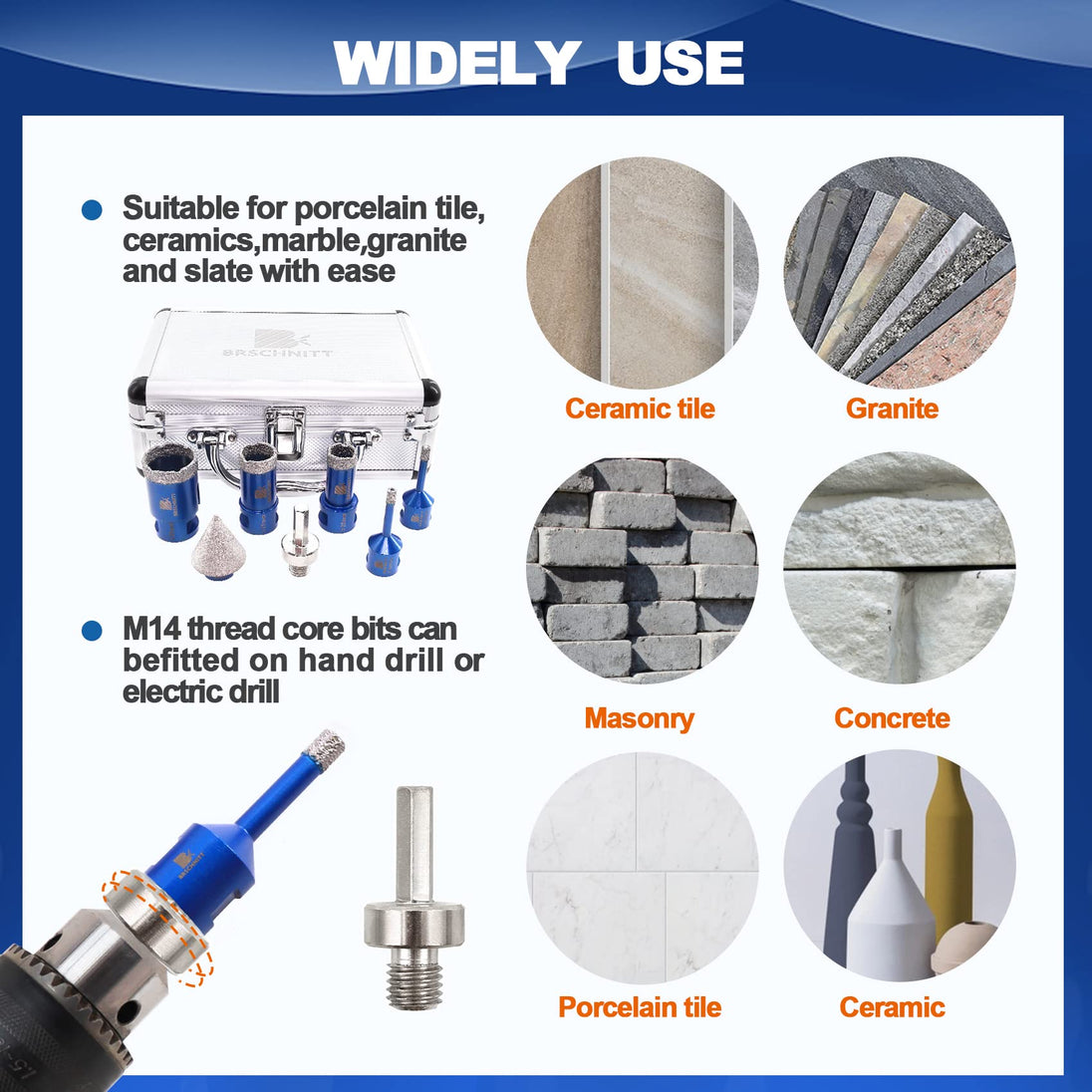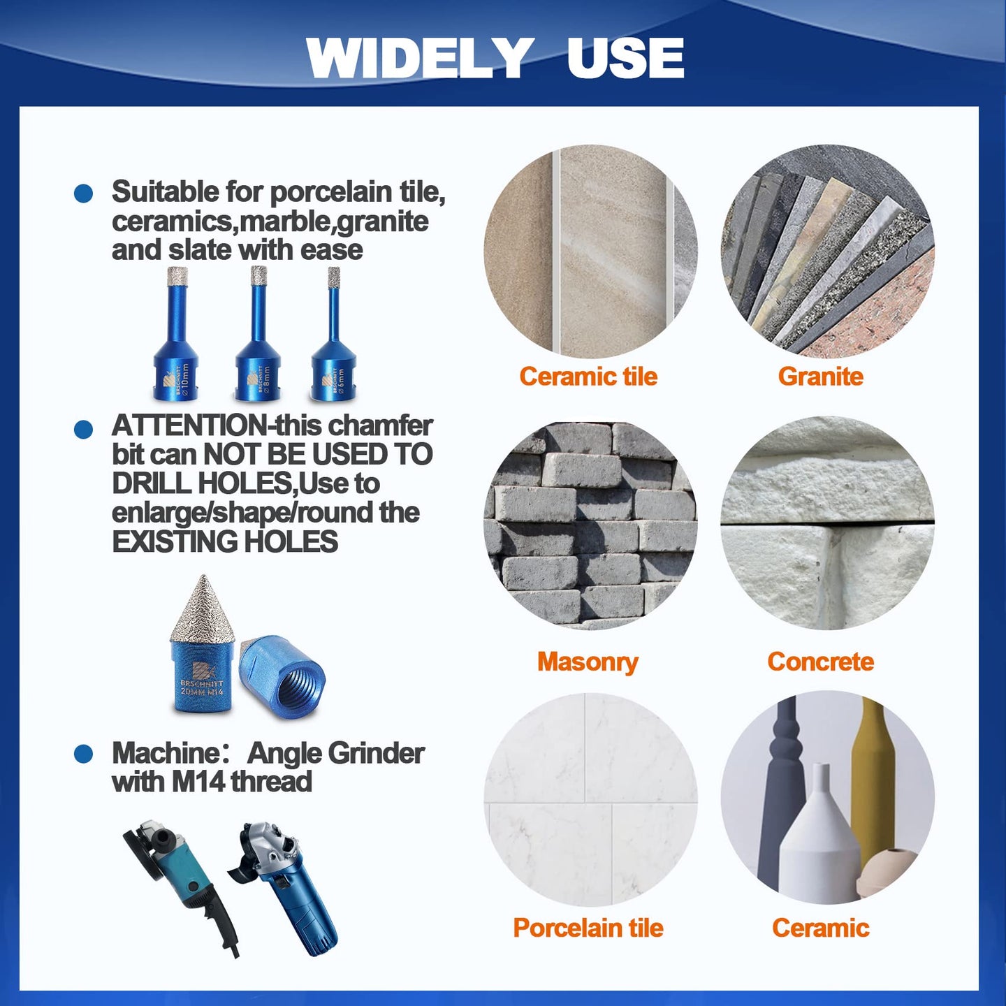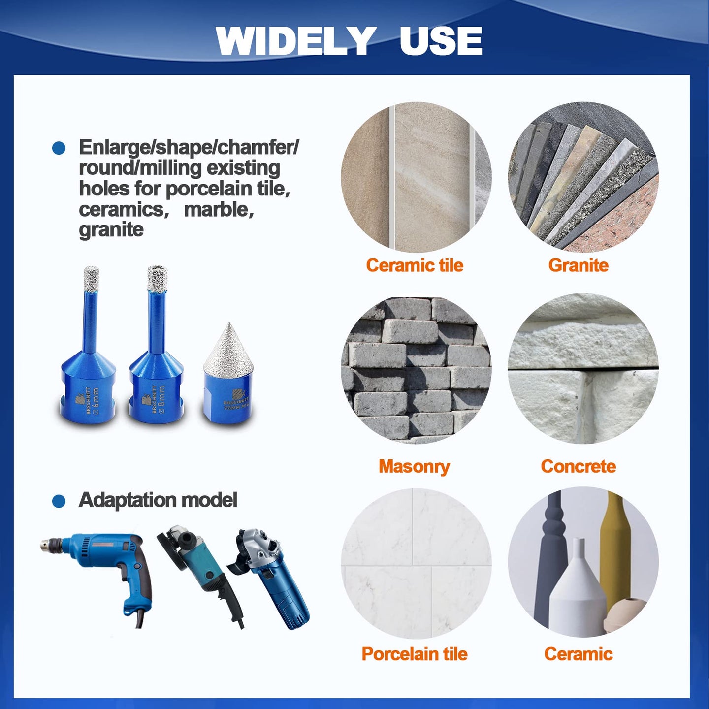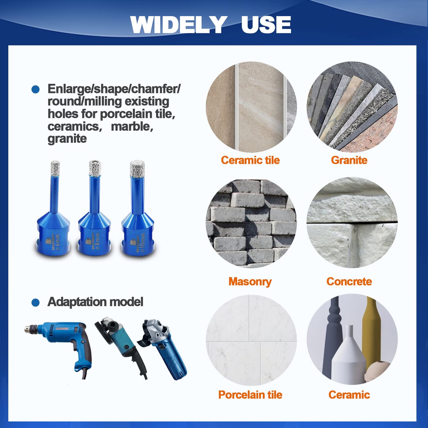 - ✔Breite Anwendung des Bohrers – Funktioniert hervorragend für Porzellanfliesen, Keramik, Badezimmerfliesen, Marmor, Granit, Stein, Mauerwerk und Ziegel. Die Verwendung von Wasser kann die Lebensdauer verlängern
