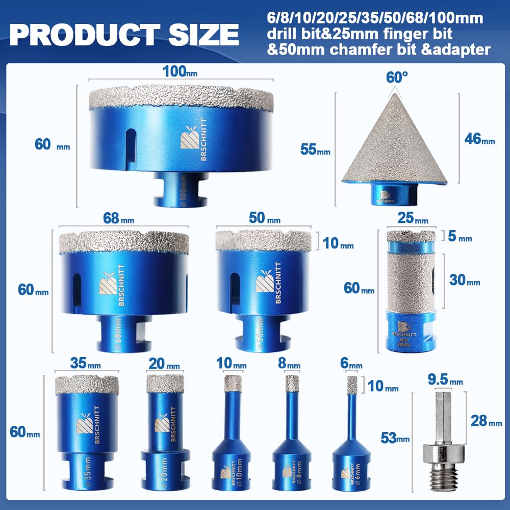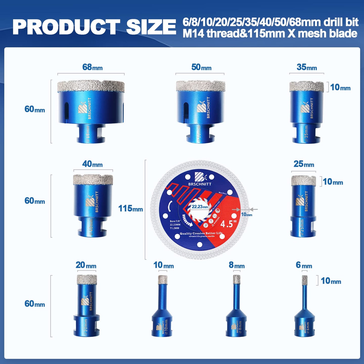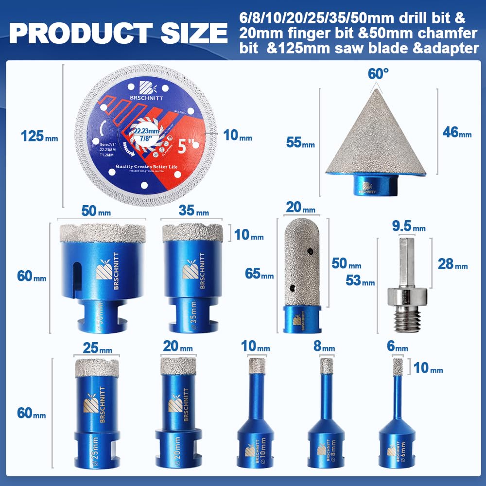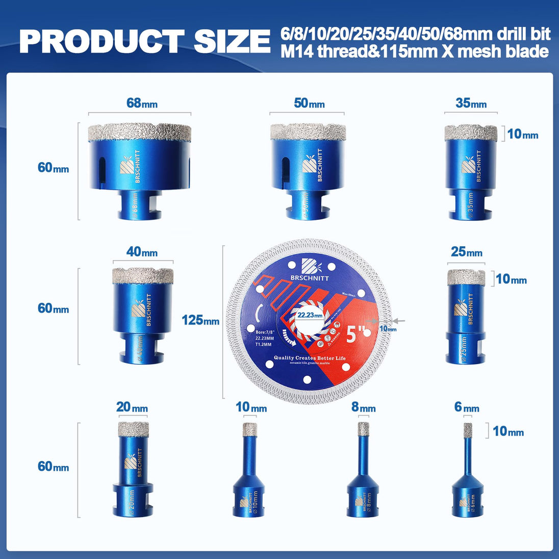 Diamantbohrer Fliesenbohrer Set - BRSCHNITT 6/8/10/20/25/35/38/50/68mm Diamant-Bohrkrone Lochsäge mit Diamant Trennscheibe 125mm