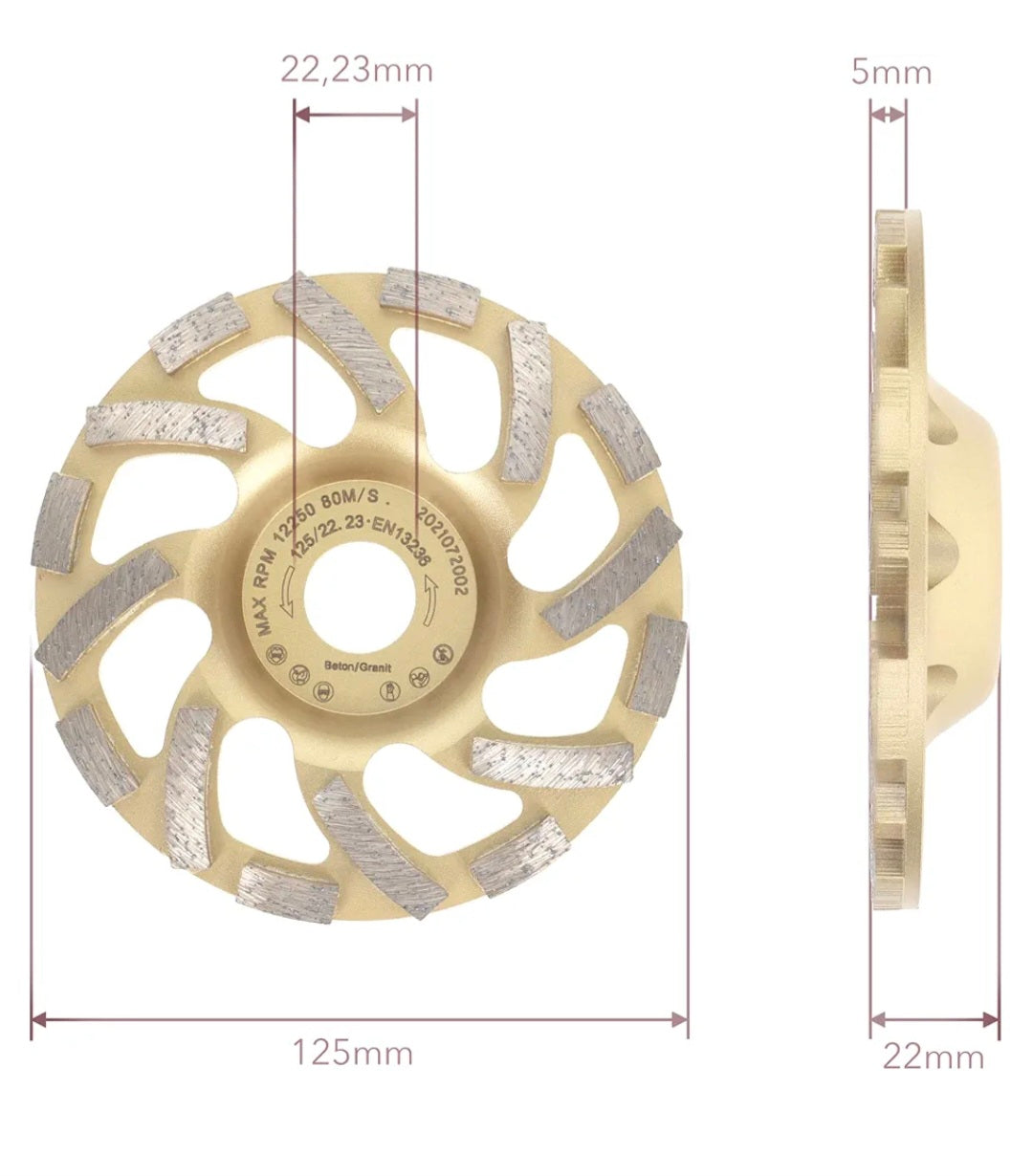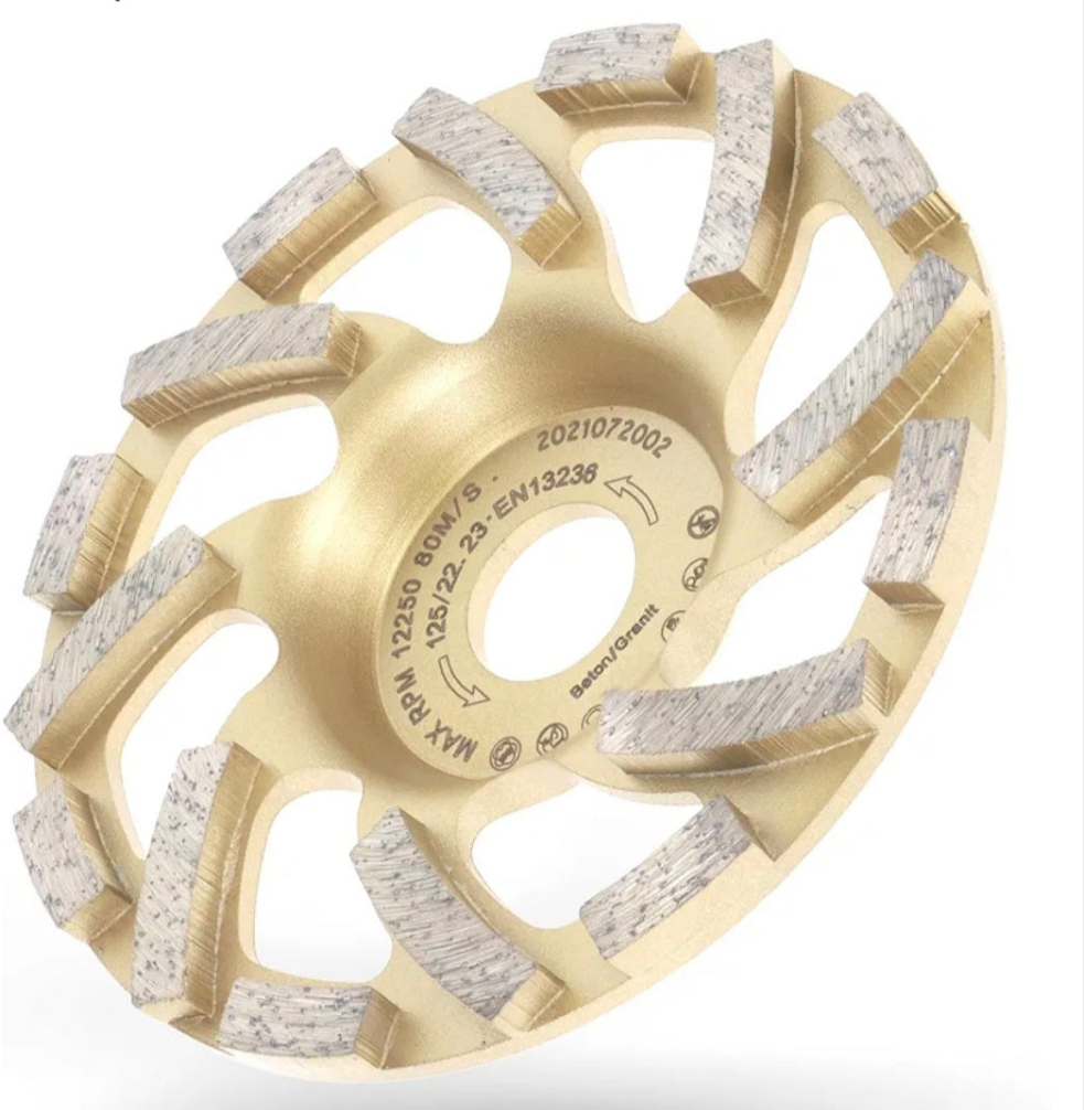 - TECHNISCHE DATEN: Diamant Topfschleifer 125mm mit 16 Segmente der höchsten Güteklasse. Bauhöhe 22mm, Segmenthöhe 5mm Aufnahmebohrung 22,23mm (entspricht M14). Die spezielle Anordnung der Segmente nutz den Drehimpuls und bedient den Luft-Sog der Stauabsaugung. Damit steigt die Effizienz von Maschine, Werkzeug und Absaugsystem