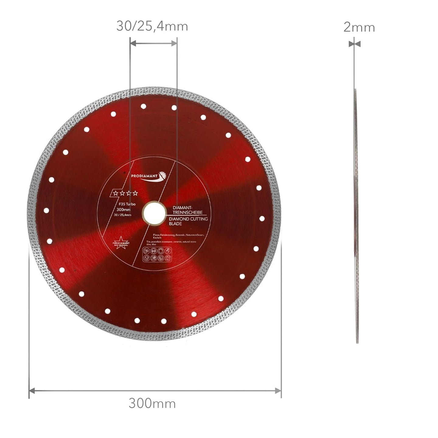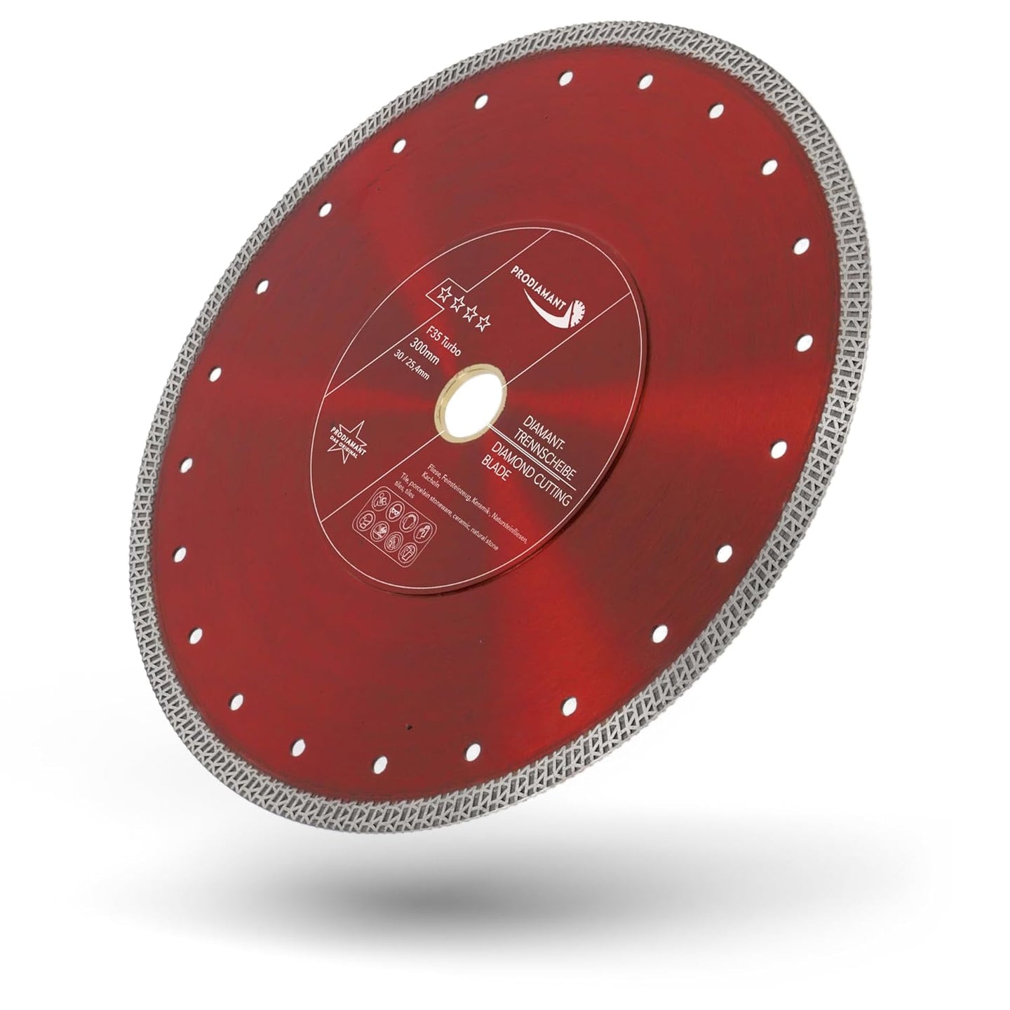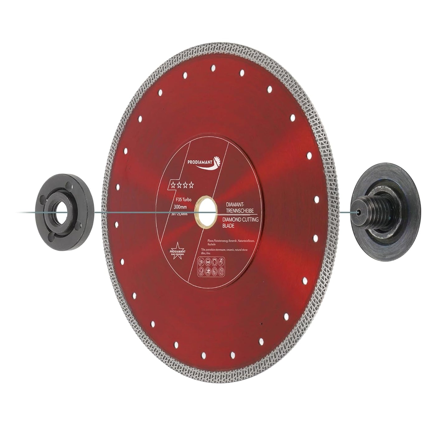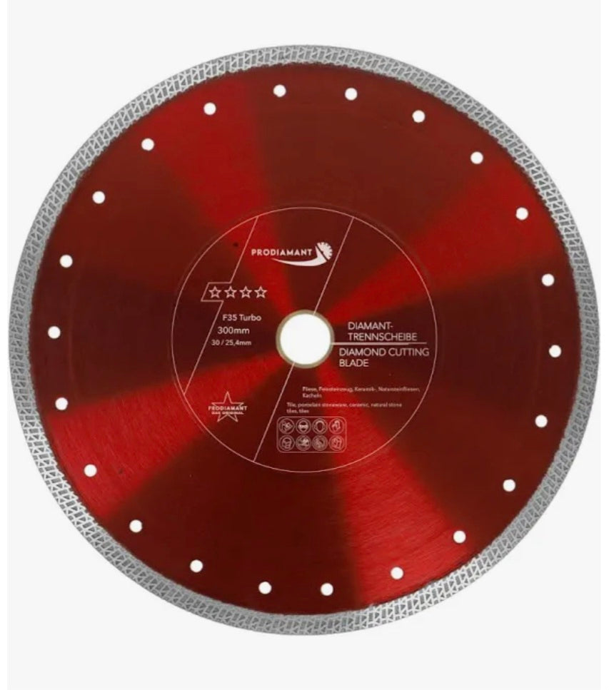 - EIGENSCHAFTEN: Die Diamant Trennscheibe F35 Turbo mit dem Durchmesser ø 300mm mit verstärktem Flansch (verstärkte Aufnahme) Bohrung 30mm und Reduzierung auf 25,4 mm, passt auf alle gängigen Maschinen mit 30/25,4mm Aufnahme.
