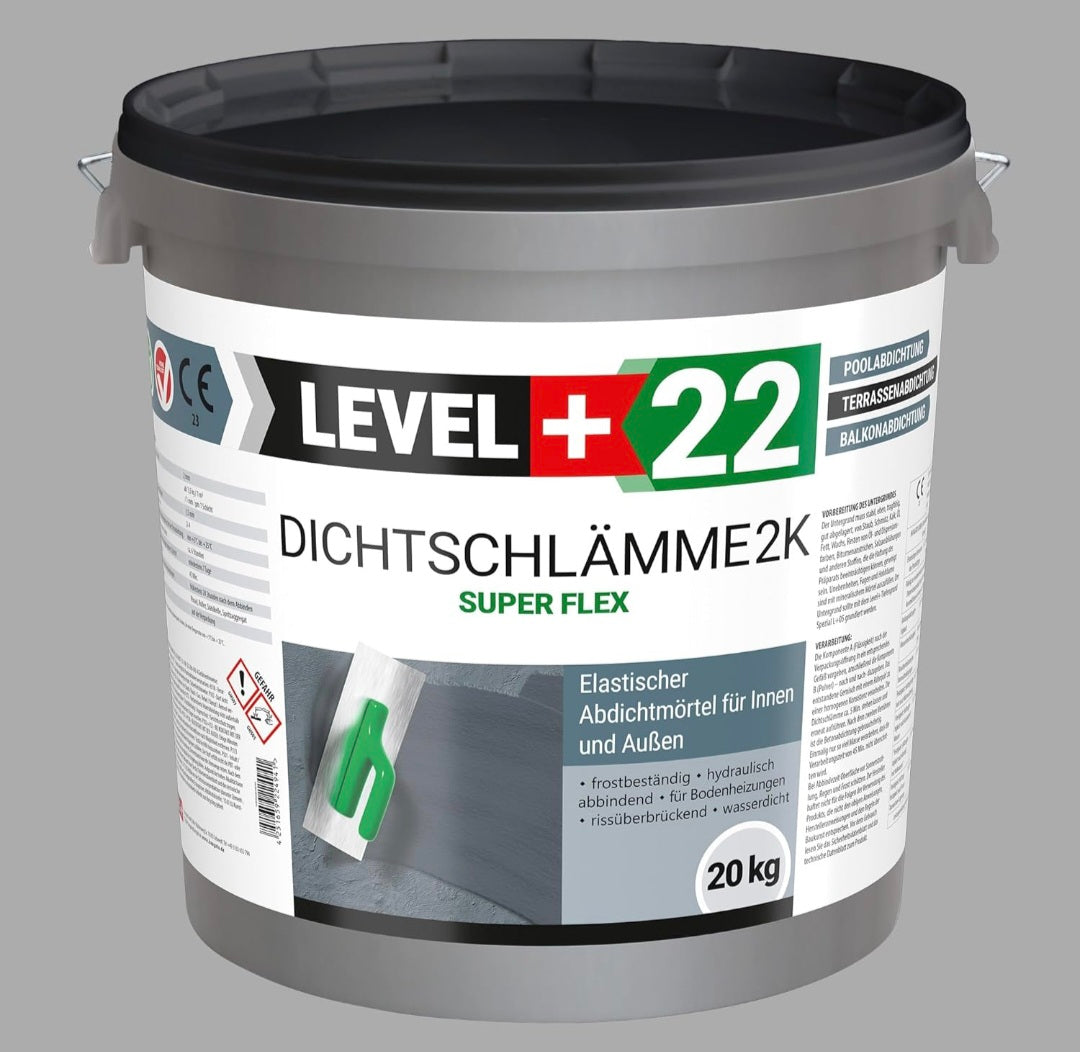Dichtschlämme 2K Super Flex 20kg, Hochelastische Abdichtung für Innen und Außen L+22, Schwimmbad, Terrasse, Balkone, Pool, Dusche