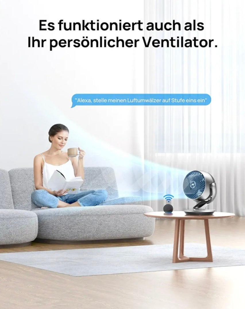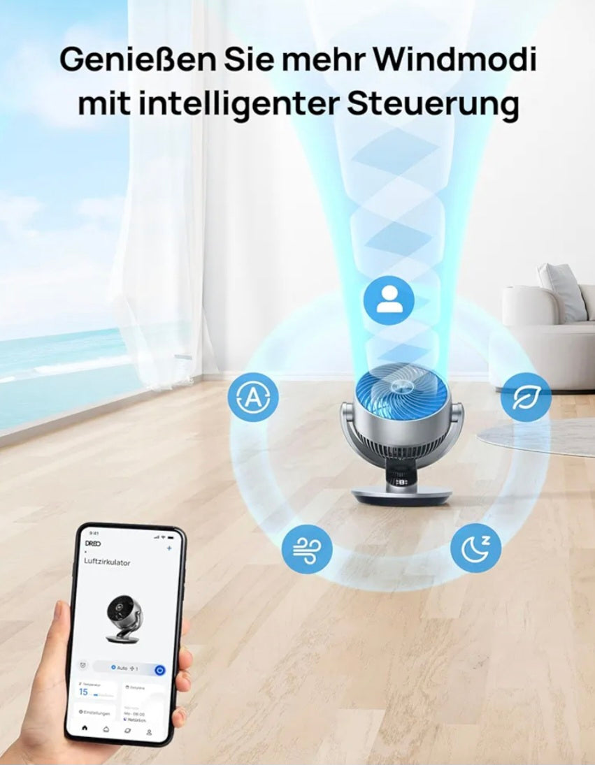 • Smart Control bereit: Verwenden Sie Ihre Stimme oder die Dreo-App und passen Sie die Luftzirkulation mit den 5 verschiedenen Windmodi und 4 Geschwindigkeiten dieses Tischventilators bequem an Ihre Bedürfnisse an, kompatibel mit Alexa, Google Assistant.