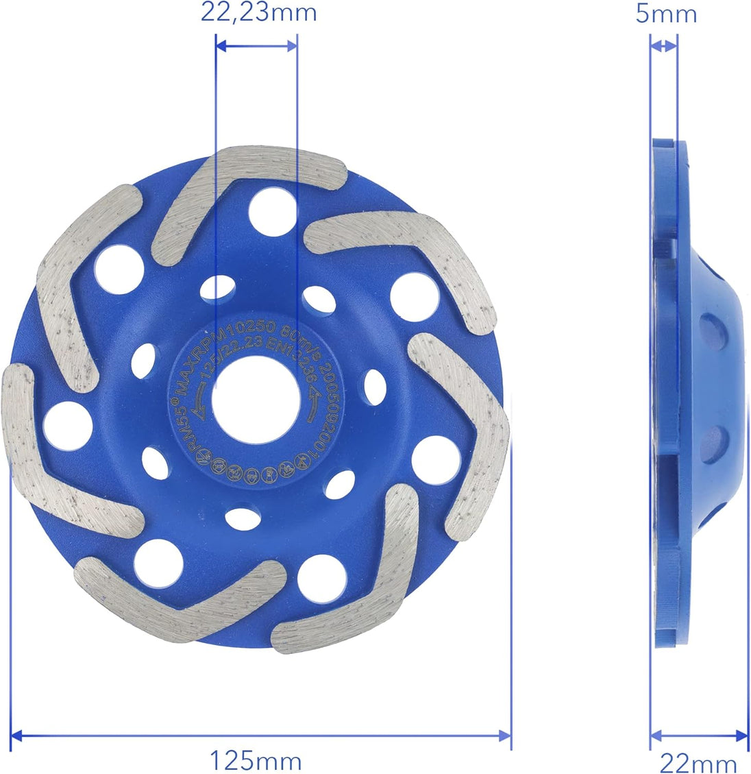 - 125mm Schleifteller Topfscheibe mit Bohrung 22,23mm, Bauhöhe 21mm, Segmenthöhe 5mm, Turbosegmentierung mit verbesserter Absaugung, passend für Winkelschleifer, Betonschleifer, Betonfräsen, Wandschleifsyteme und Bodenschleifer der Marken Bosch, Makita, Festool, Flex, Metabo, Würth, Einhell, Hitachi, Milwaukee, DeWalt und weitere