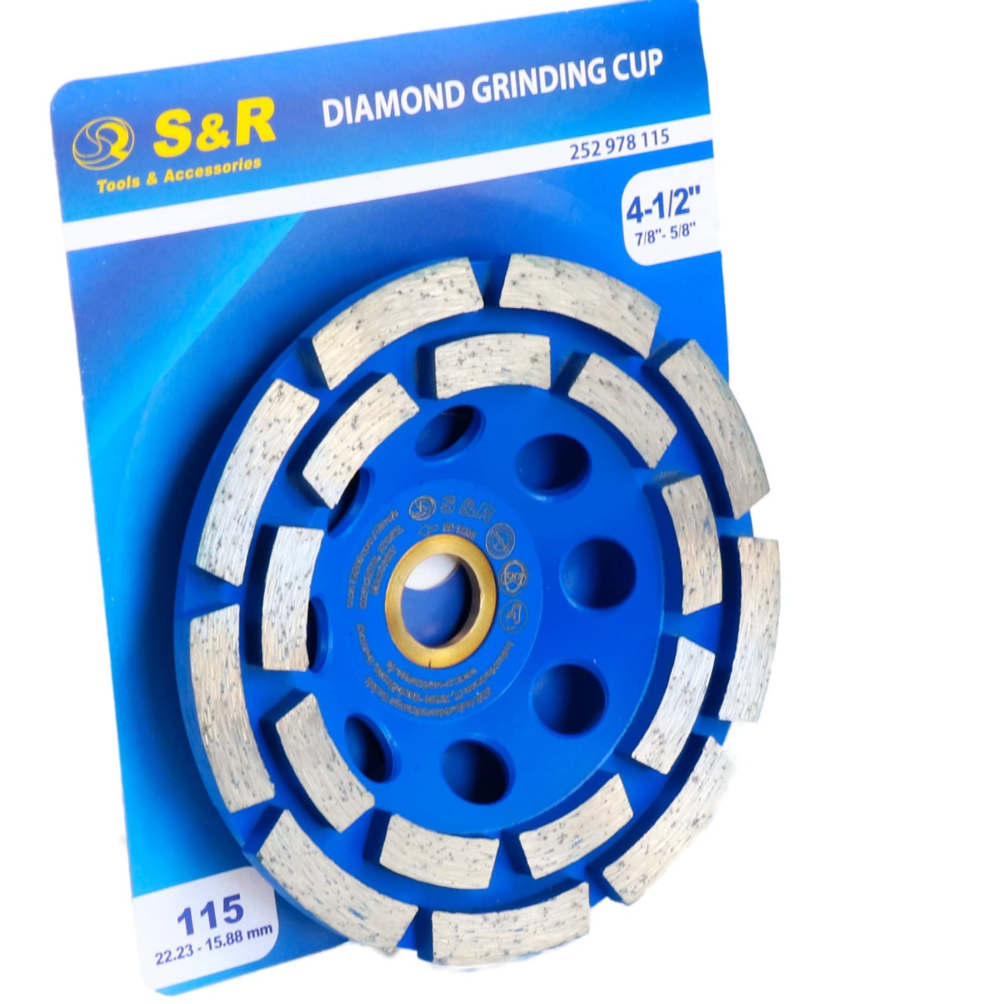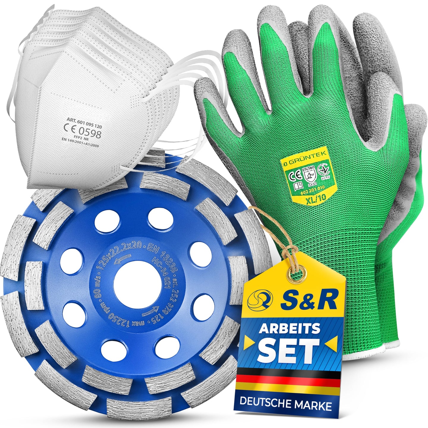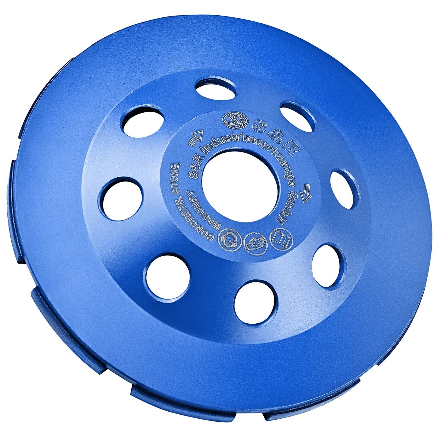 Die maximal empfohlene Anzahl von Umdrehungen pro Minute beträgt 12.200. Die Schleifscheibe ist doppelt segmentiert mit angepassten SauglöchKompromisslose Schleifleistung: Die professionelle S&R Diamant-Topfscheibe 125 mm verfügt über besonders robuste Schleifsegmente und eignet sich ideal zum Schleifen von Beton, Naturstein, Granit, Mauerwerk, Ziegel, Estrich und trockenem Fliesenkleber. Profitieren Sie von einer langen Lebensdauer bei intensiver Nutzung.