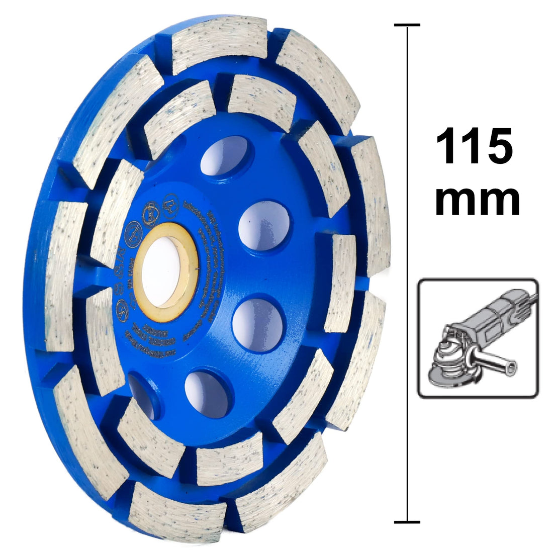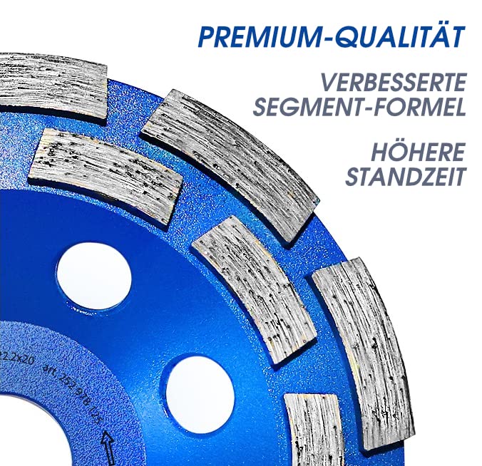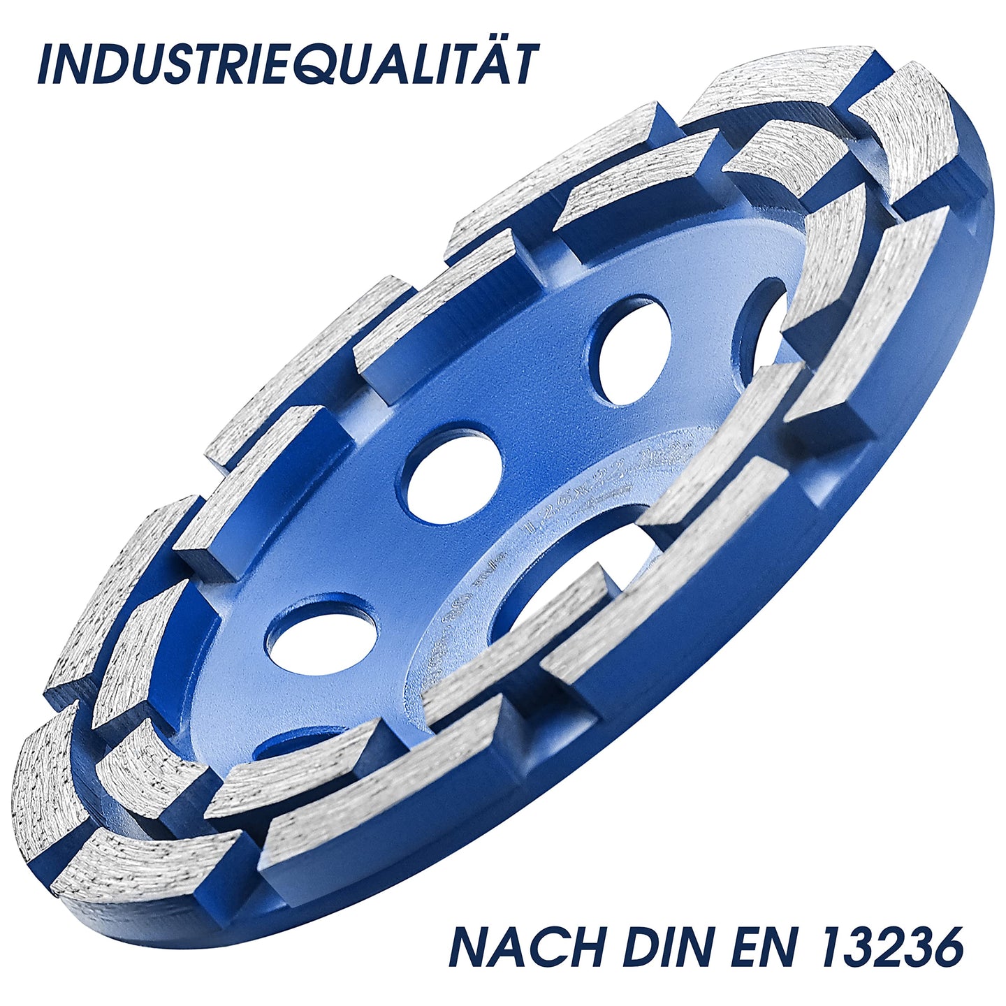 - Effizienter Materialabtrag: Dank der verbesserten Segmentformel der 2-reihigen Diamantschleifscheibe bietet die Topfscheibe eine hohe Abtragsleistung für harte Untergründe wie Beton, Ziegel, Mauerwerk, Estrich, Granit und Marmor oder Naturstein sowie trockenen Fliesenkleber. Das besonders temperaturbeständige Industriediamantkorn hat eine lange Lebensdauer, auch bei intensiver gewerblicher Nutzung.