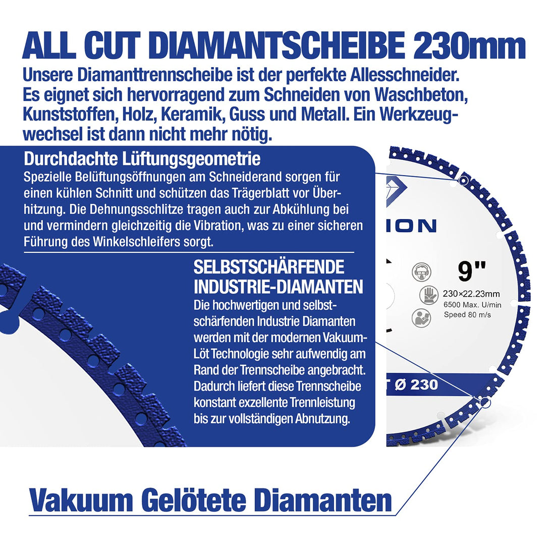 Sedionยฎ Diamanttrennscheibe 230mm x 22,23 - Exklusiver Universal Allesschneider Trennscheibe fรผr Stahl, Eisen, Alu, Kunststoff, Beton uvm.- Ultimative Prรคzisons Diamantscheibe 230 in Premium-Qualitรคt!