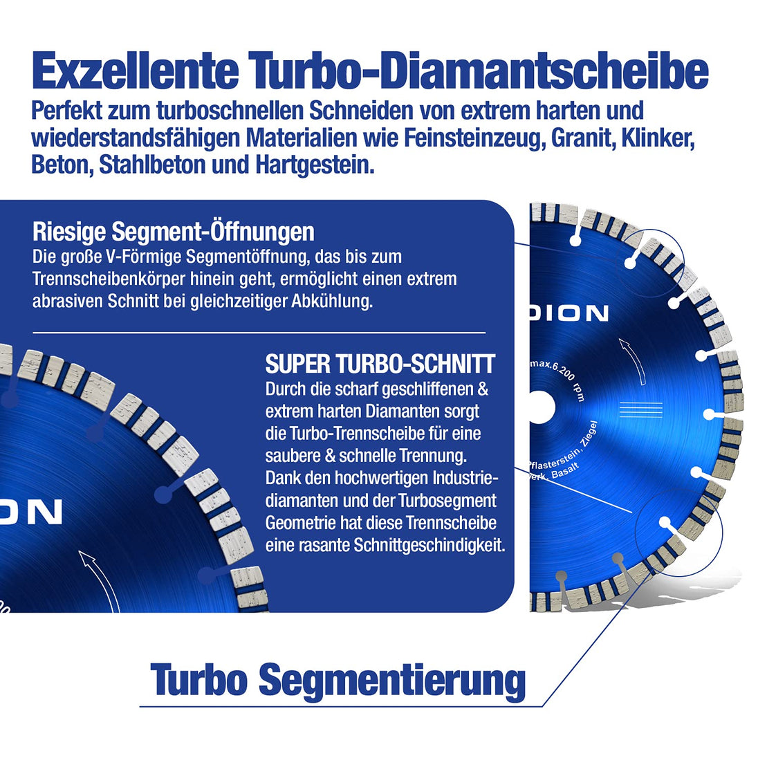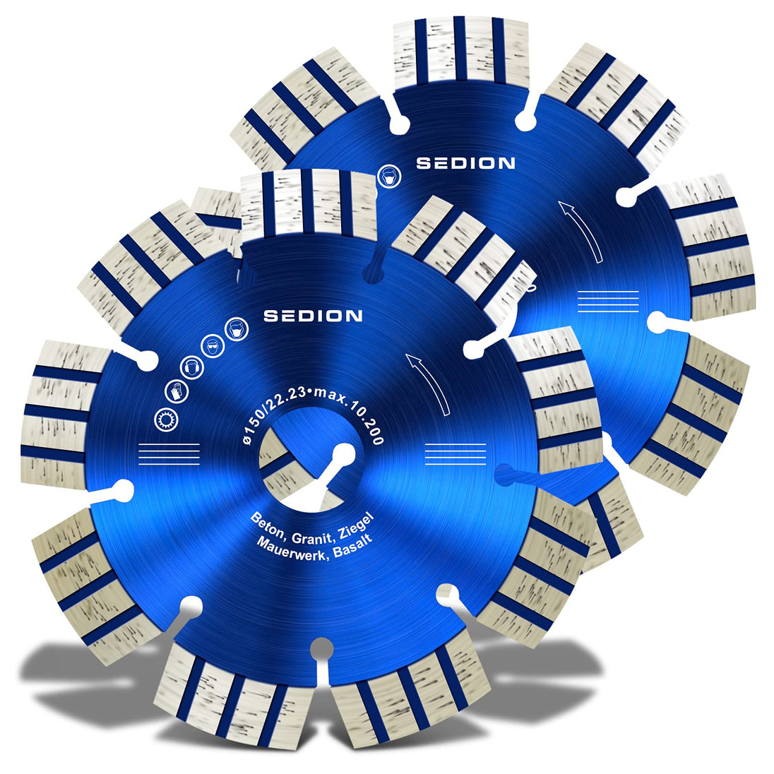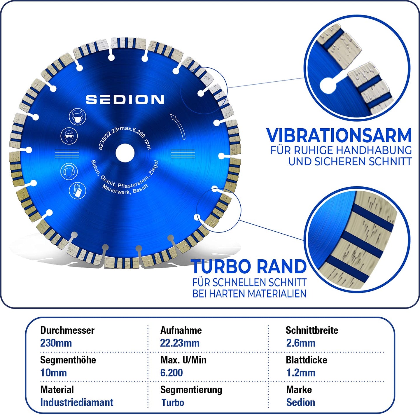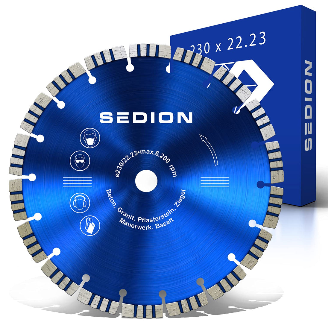 SEDION ® Diamanttrennscheibe 230 mm - Trennscheibe zum Trennen von Stein Beton Stahlbeton Pflastersteine Klinker Granit Asphalt Basalt - 230mm x 22,23 - Sedion Premium Qualität - Diamant Steinscheibe