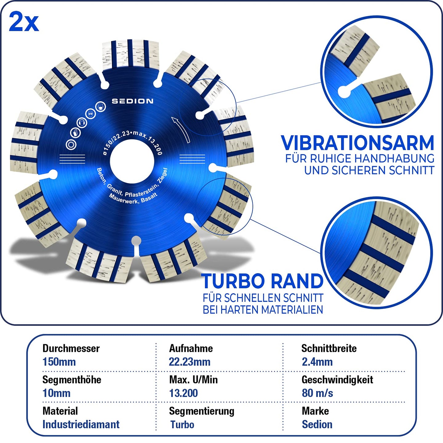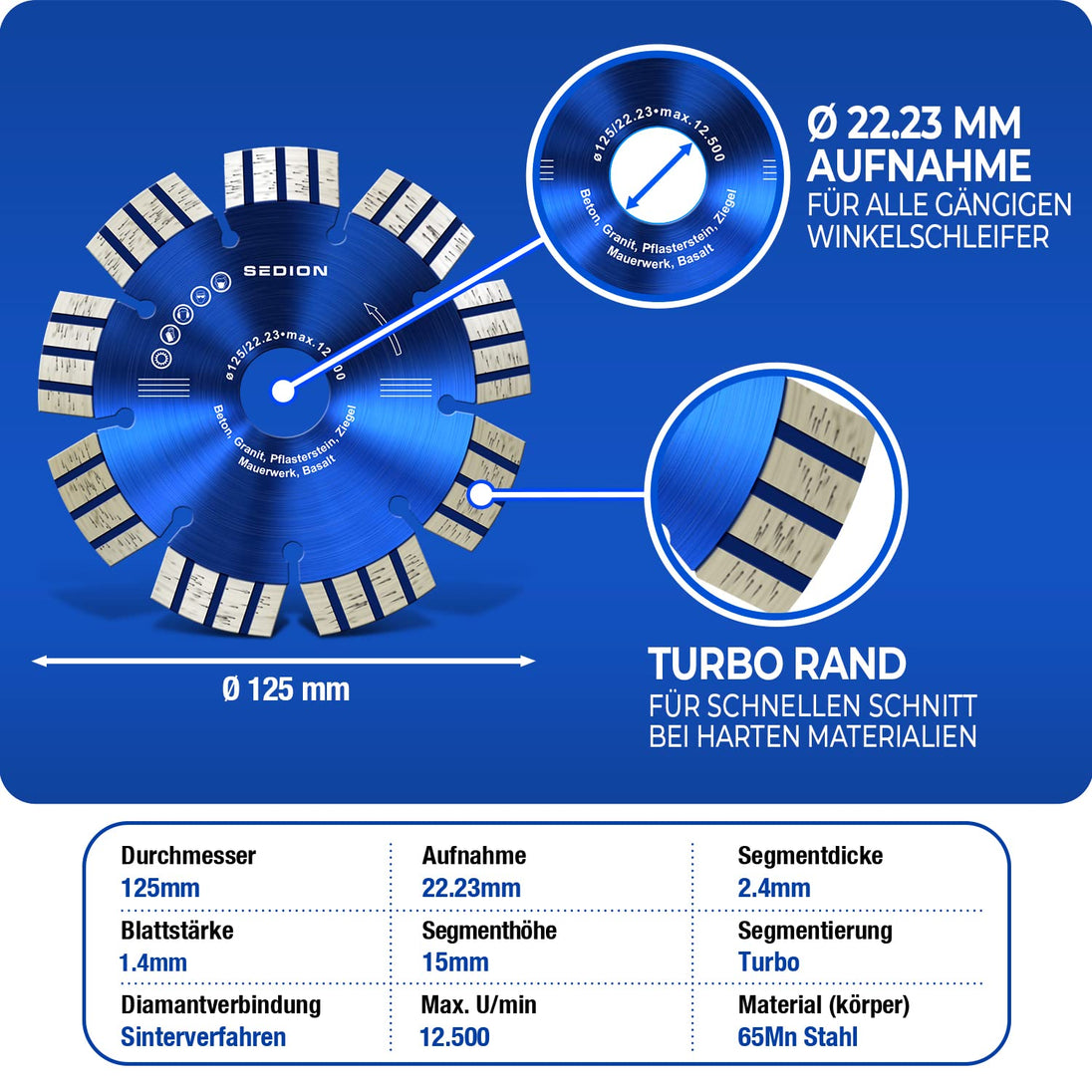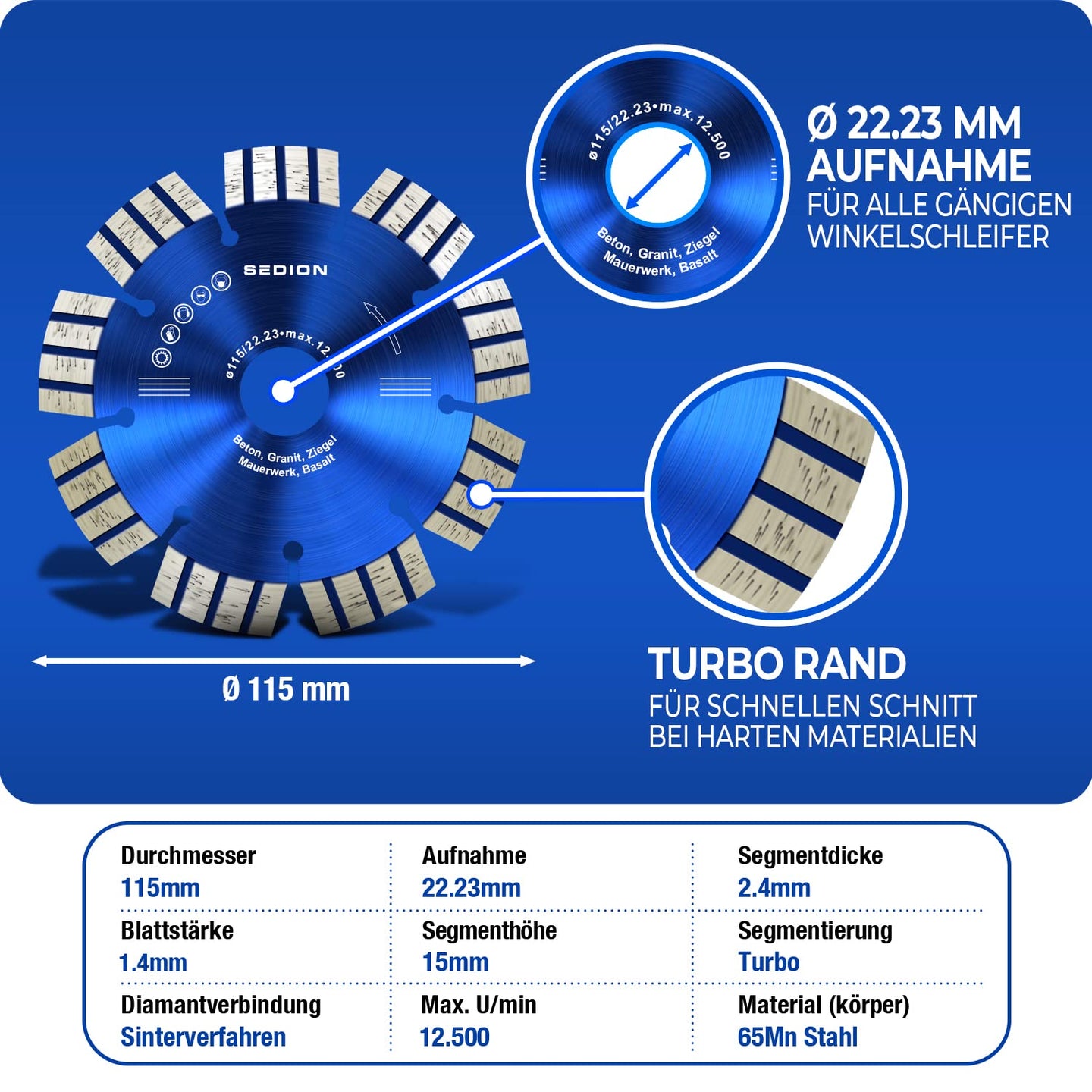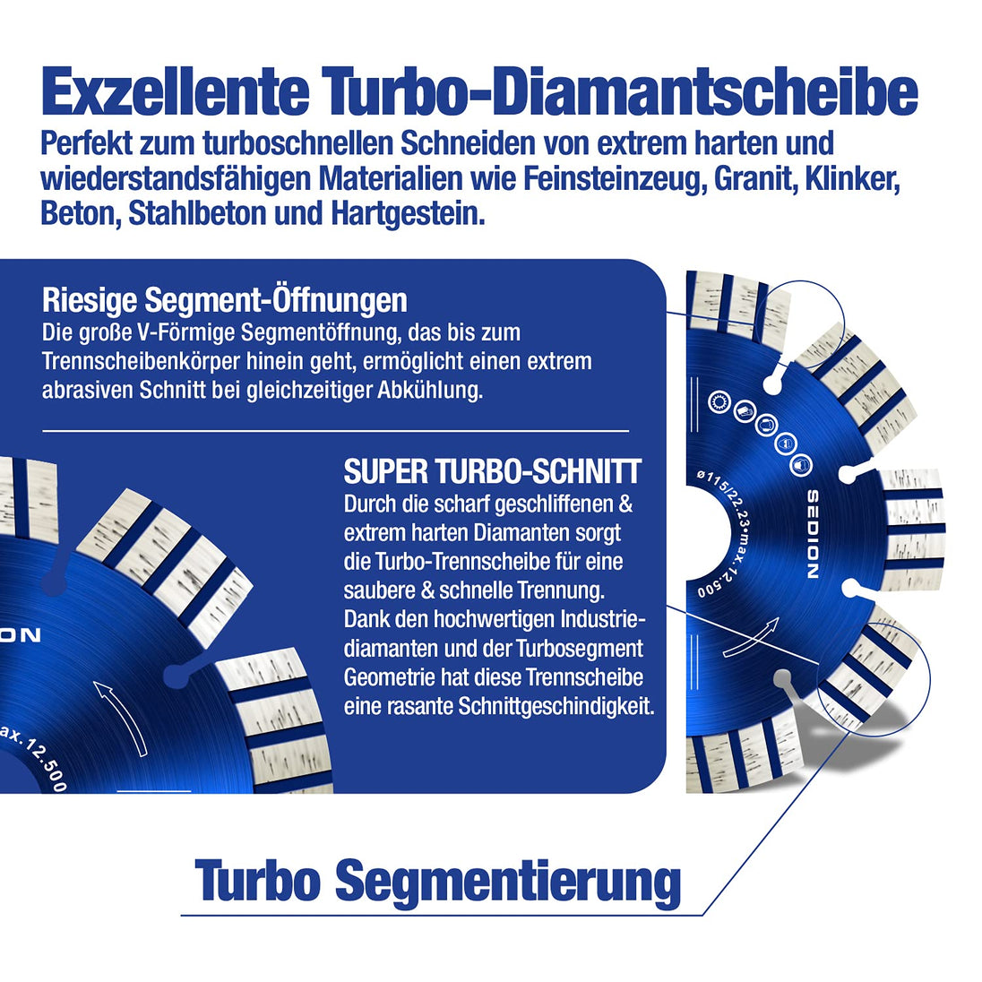 SEDION ® Diamanttrennscheibe 230 mm - Trennscheibe zum Trennen von Stein Beton Stahlbeton Pflastersteine Klinker Granit Asphalt Basalt - 230mm x 22,23 - Sedion Premium Qualität - Diamant Steinscheibe