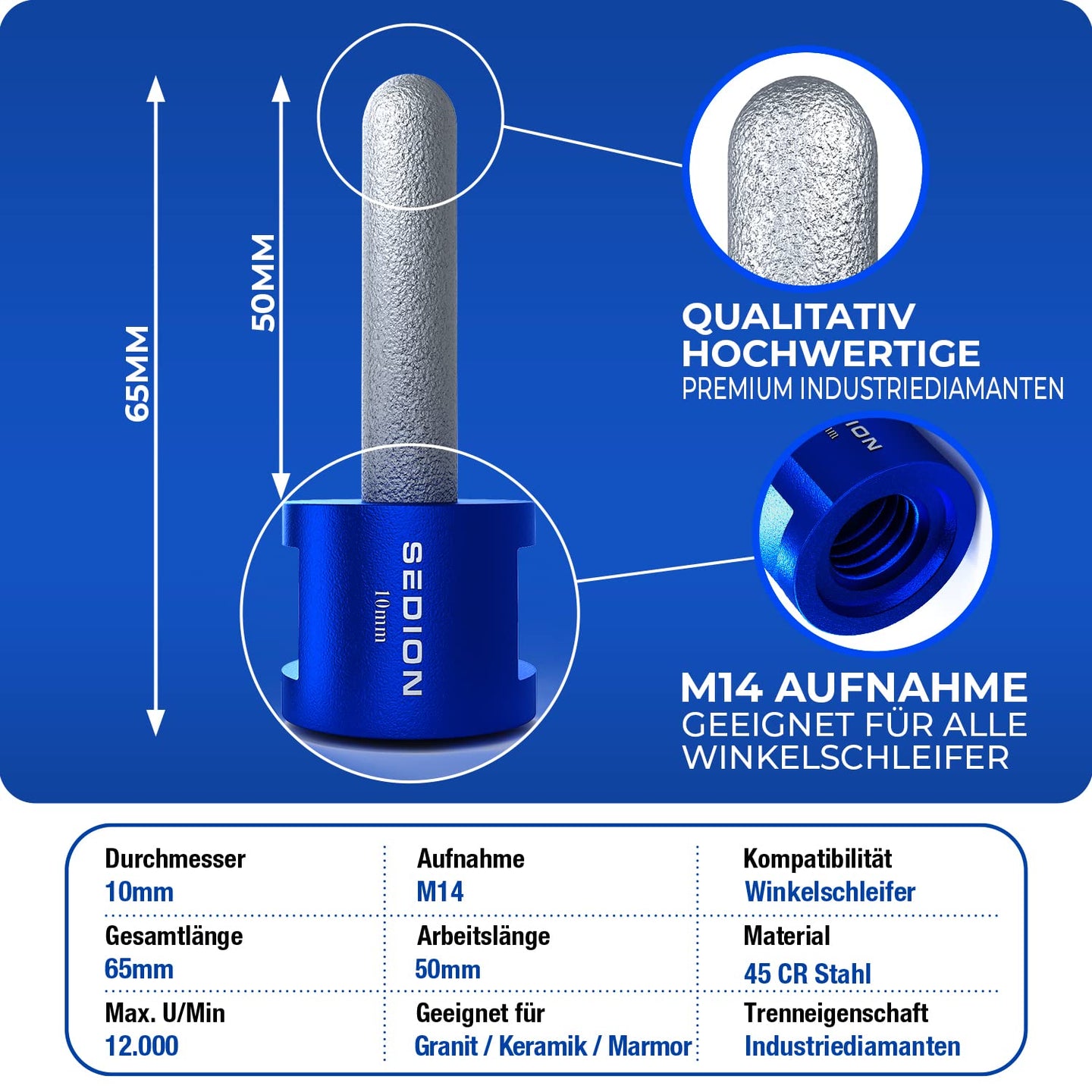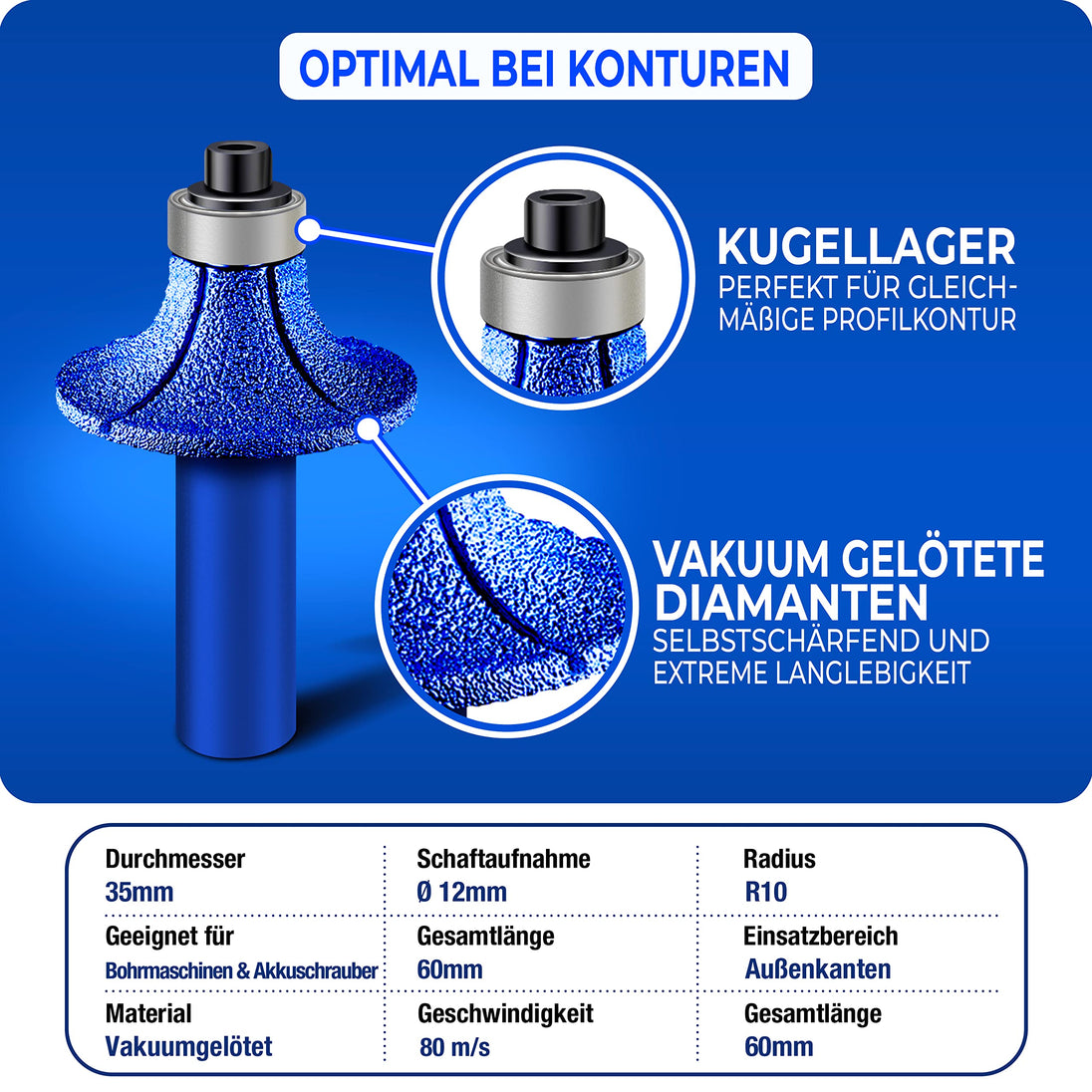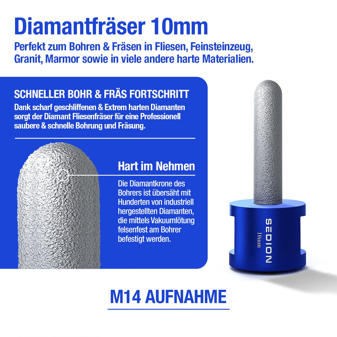 - Hohe Haltbarkeit – dank des Kühlwachses im Kern ist es selbstkühlend und selbstschärfend. Darüber hinaus verfügt es über eine lange Lebensdauer durch hochwertige und temperaturbeständige Diamanten.