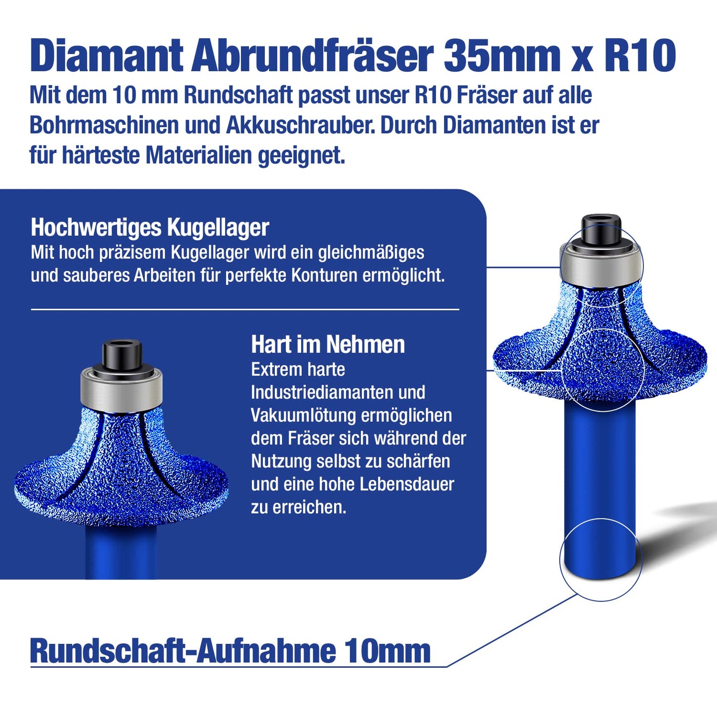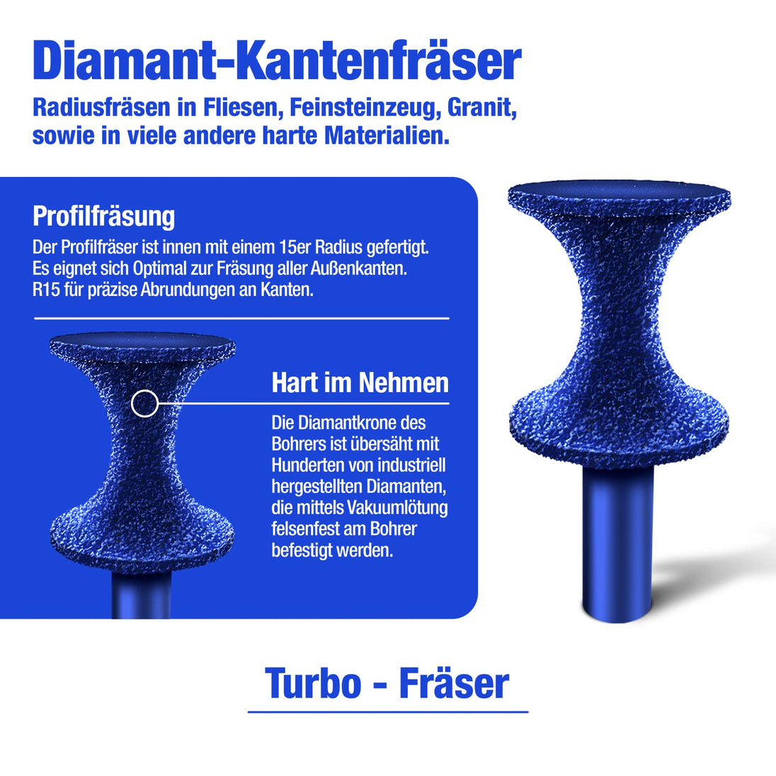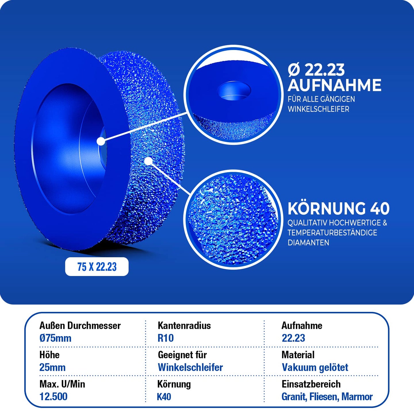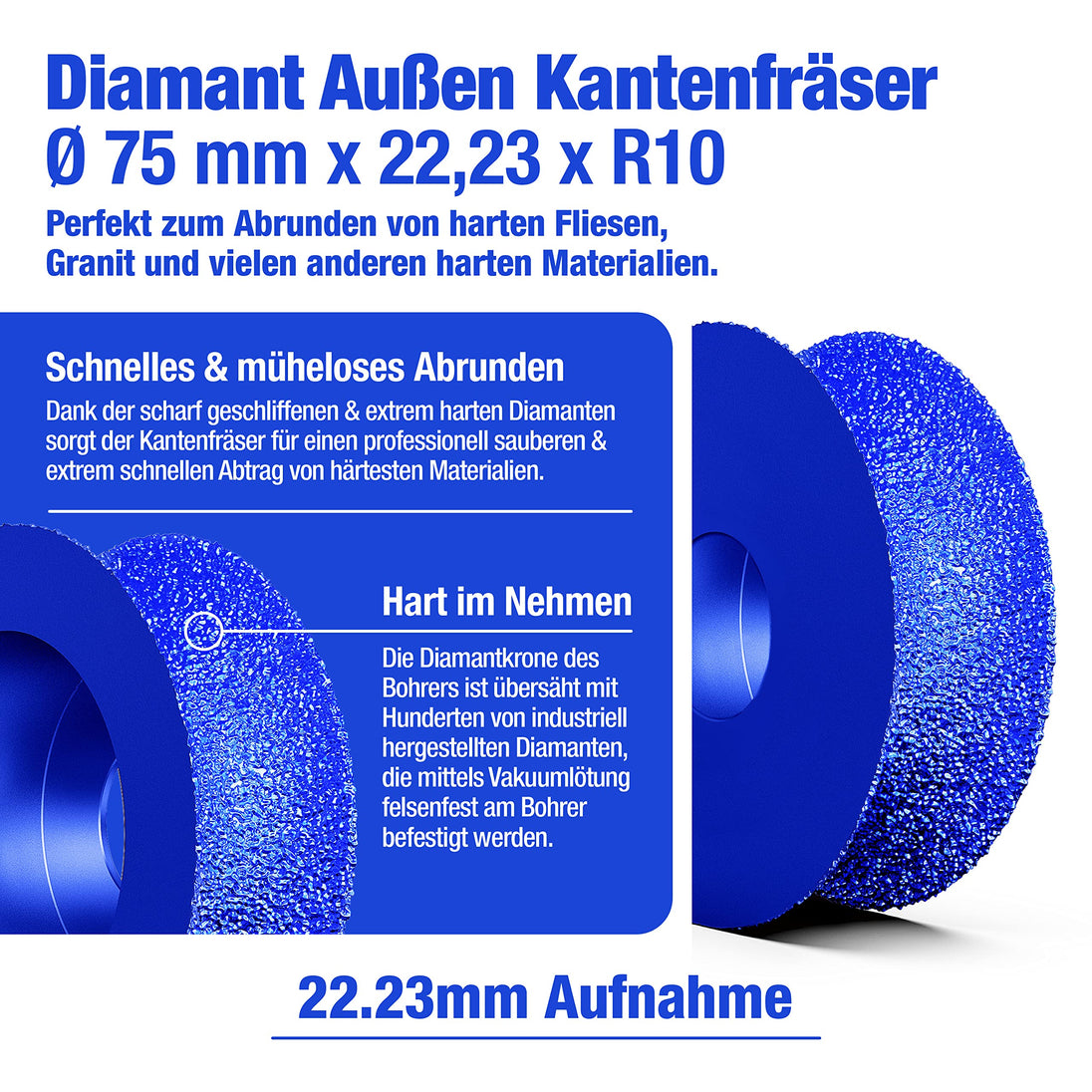 Diamant Aussen Kantenfräser Ø 75 mm Premium x 22,23 R10 - Exzellente Qualität zum Abrunden von harten Fliesen & Granit - Abrundfräser für hochwertige Präzise Ergebnisse - Radiusfräser 75mm R10
