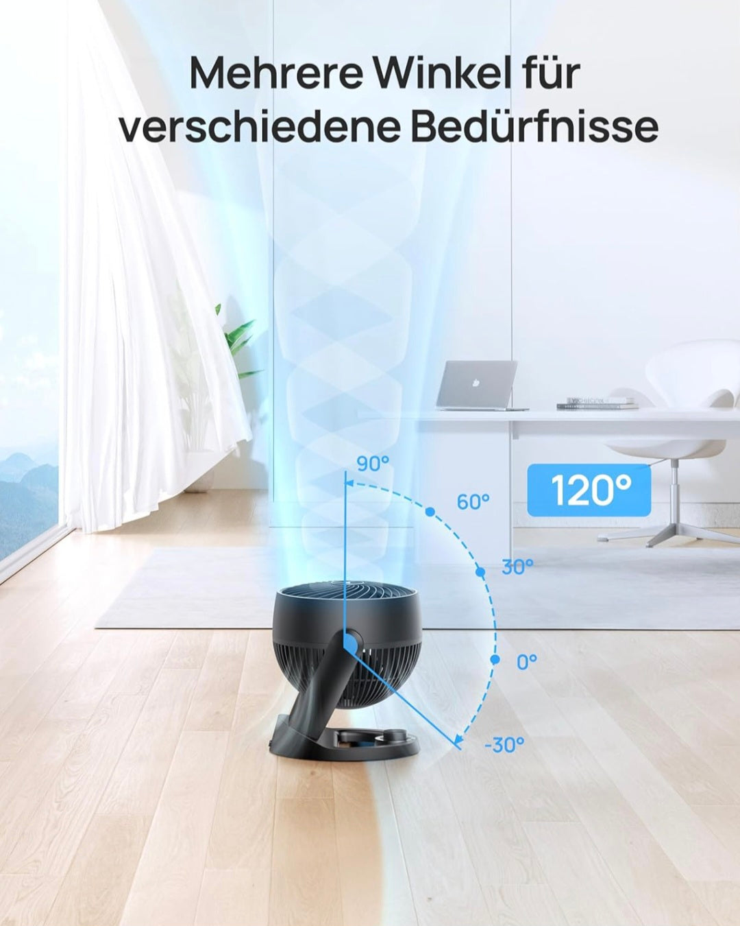 - Verstellbare Neigung, ideal für den Einsatz in mehreren Räumen: Ändern Sie manuell den Winkel innerhalb eines Bereichs von 120°, um die Luft Ihres Kühlventilators dorthin zu lenken, wo Sie sich gerade befinden. Dieser Zirkulationsventilator ist der perfekte Begleiter für Ihre Küche, Ihr Schlafzimmer oder Ihr Wohnzimmer an heißen Sommertagen.