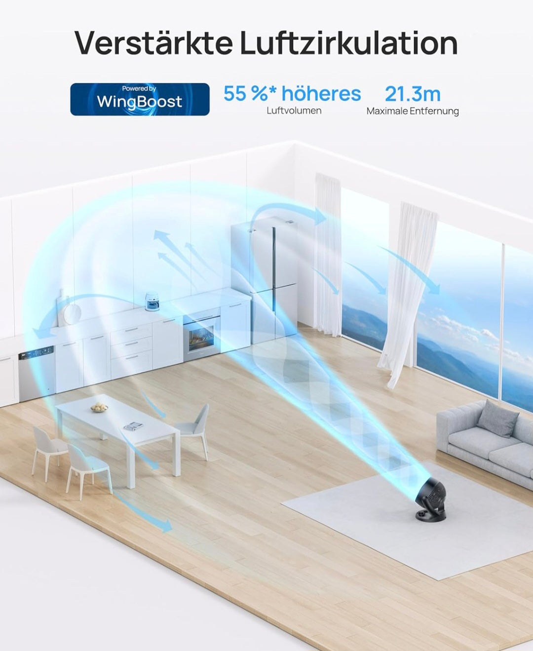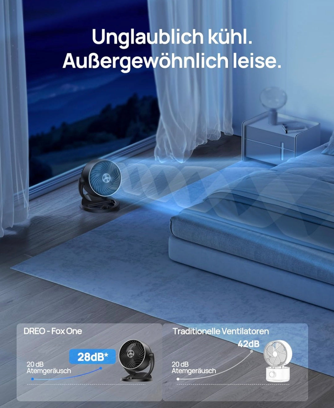 - Zirkulationskraft für Ihren gesamten Raum: Das WingBoost-System von Dreo kombiniert tief geneigte Flügel und aerodynamisches Design, um Luft bis zu 21.3 Metern weit zu treiben. So kann Ihr Tischventilator die Luft im gesamten Raum zirkulieren lassen und große Bereiche schneller kühlen als herkömmliche Tischventilatoren