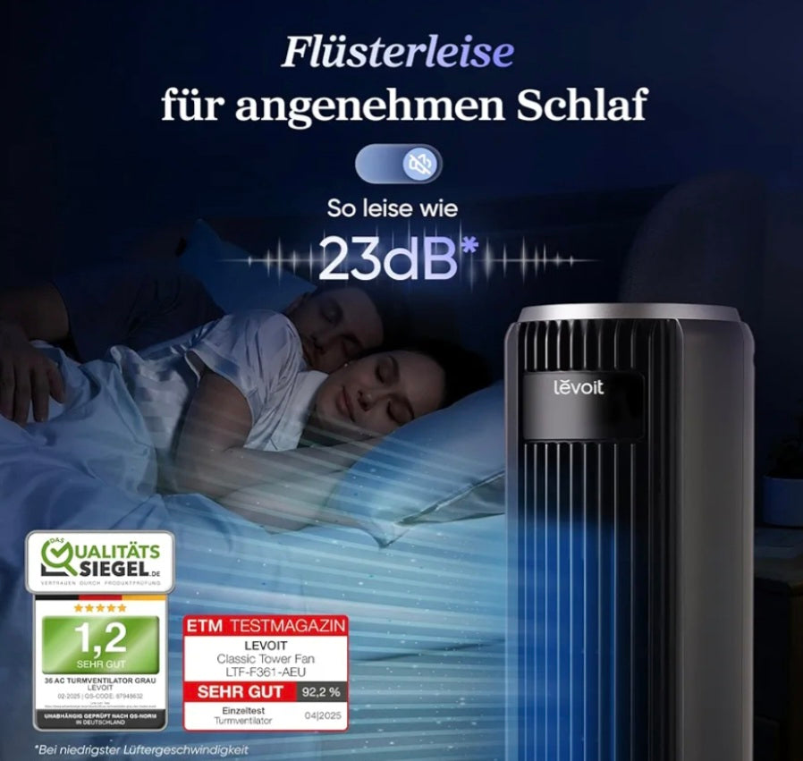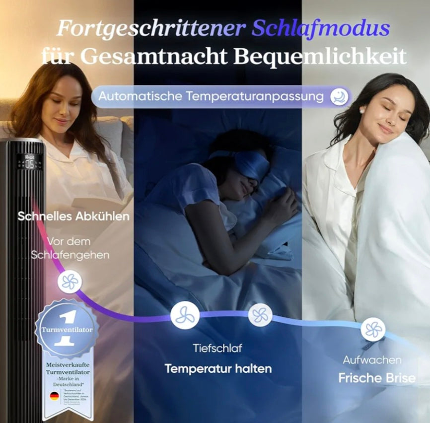 - Der Ventilator ist mit intelligentem Sensor und Reglersystem ausgerüstet, um die passende Geschwindigkeit an die Schlafphasen anzupassen und eine ruhige Nacht bei der idealen Temperatur zu ermöglichen