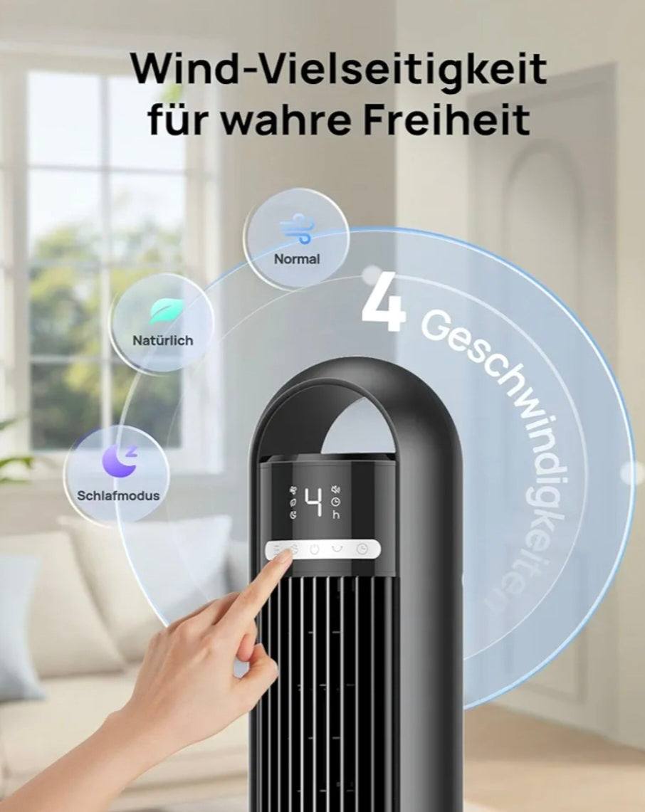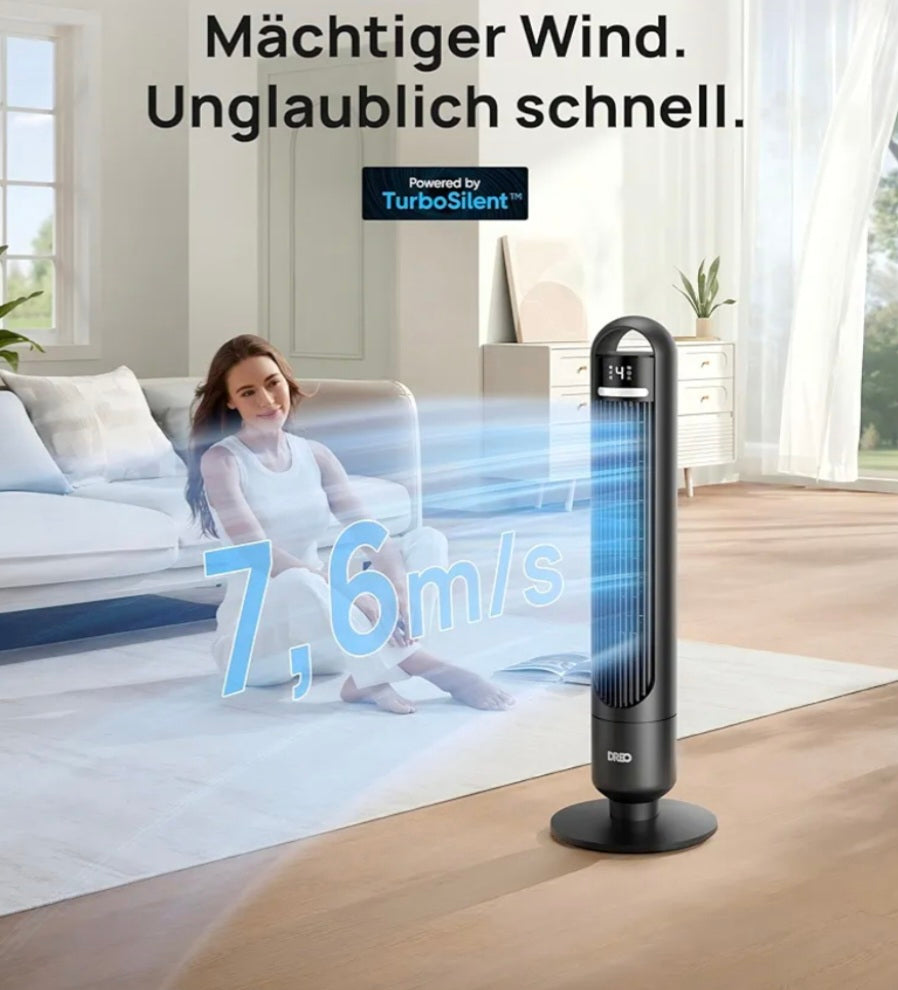• 9,8 m Wurfweite: Dieser Turmventilator ist mit einem leistungsstarken Motor und einem einzigartigen Luftkanal ausgestattet, der eine Geschwindigkeit von 7,6m/s erreichen und den Luftstrom effektiv im Raum verteilen kann. So können Sie schnell die Kühle genießen
