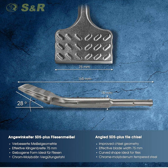 Hochleistungs - Fliesenmeisel SDS plus 165 mm x 75 mm abgewinkelt, Meissel in Industrie-Qualität Made in Germany, optimierte Geometrie für Fliesen und Fliesenkleber, gehärtet, breit