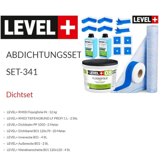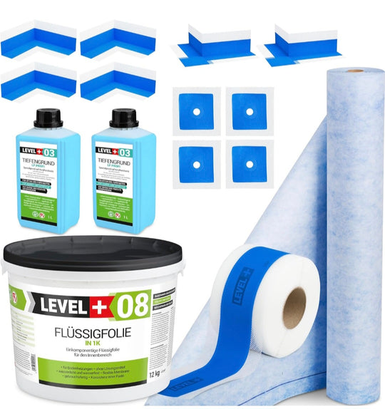 Dicht-Set 12Kg Flüssigfolie, 2m2 Dichtbahn, 20m Dichtband, 4 Innenecken, 2 Außenecke, 4 Wandmanschetten, 2L Tiefengrund, Dusche, Bad, Küche