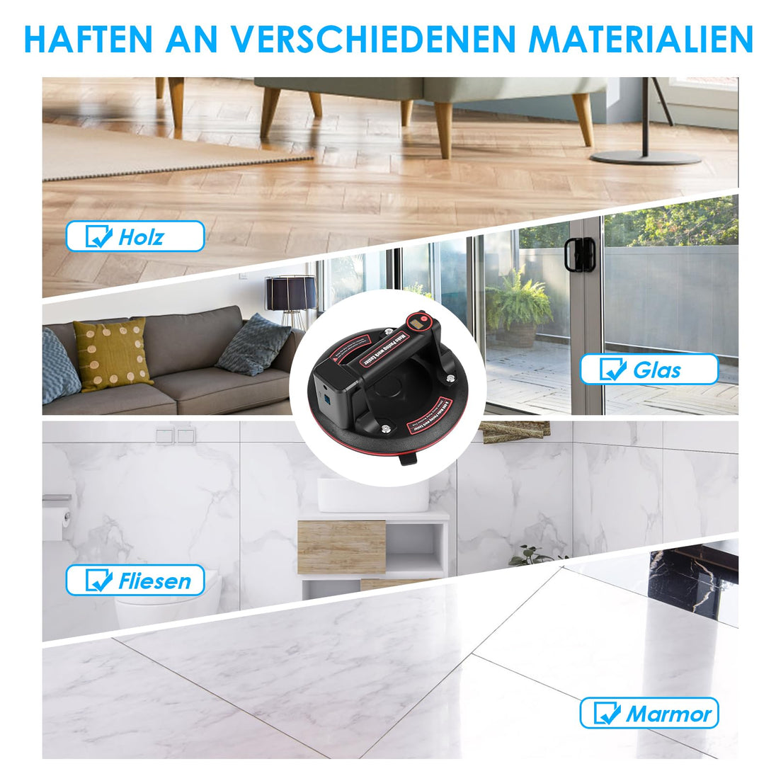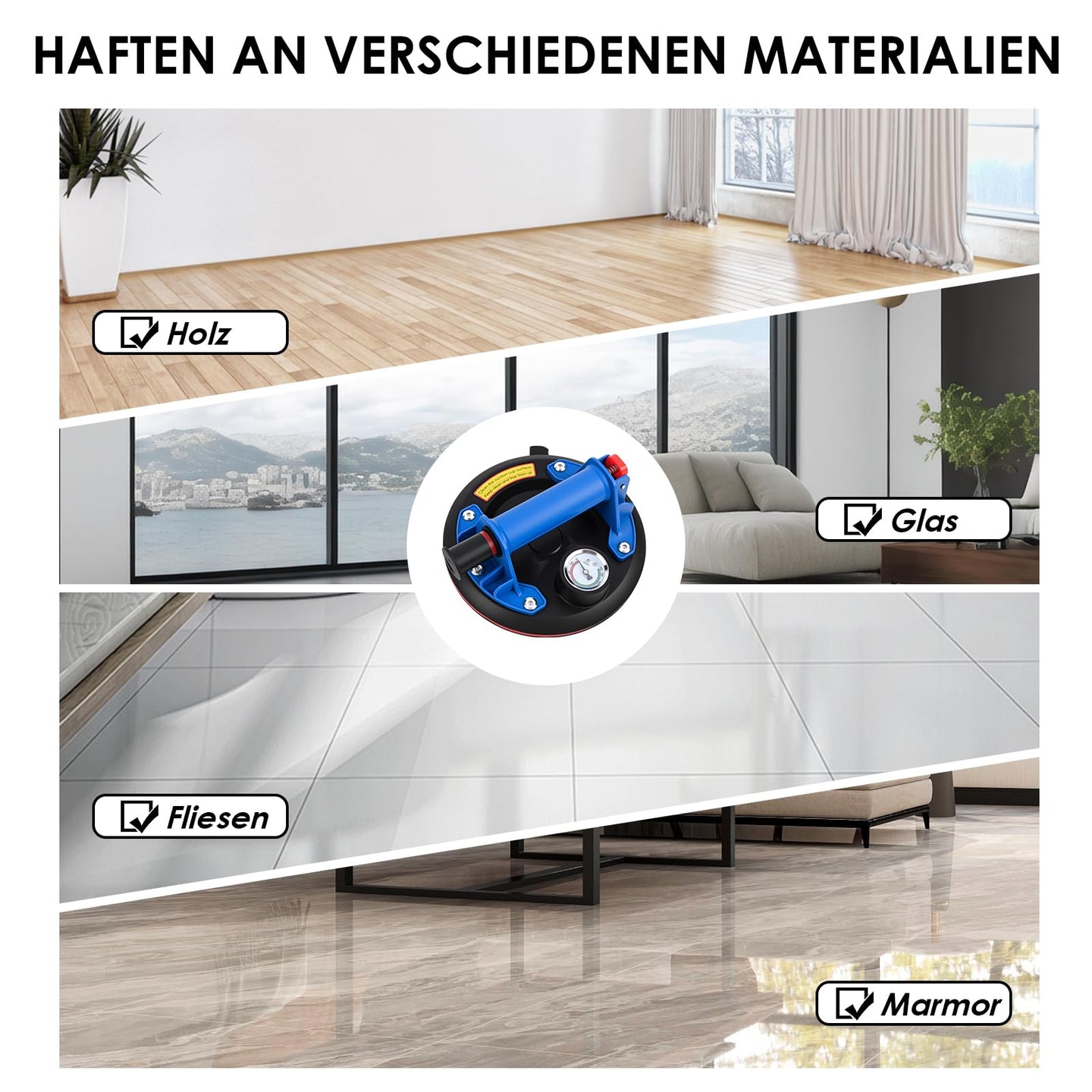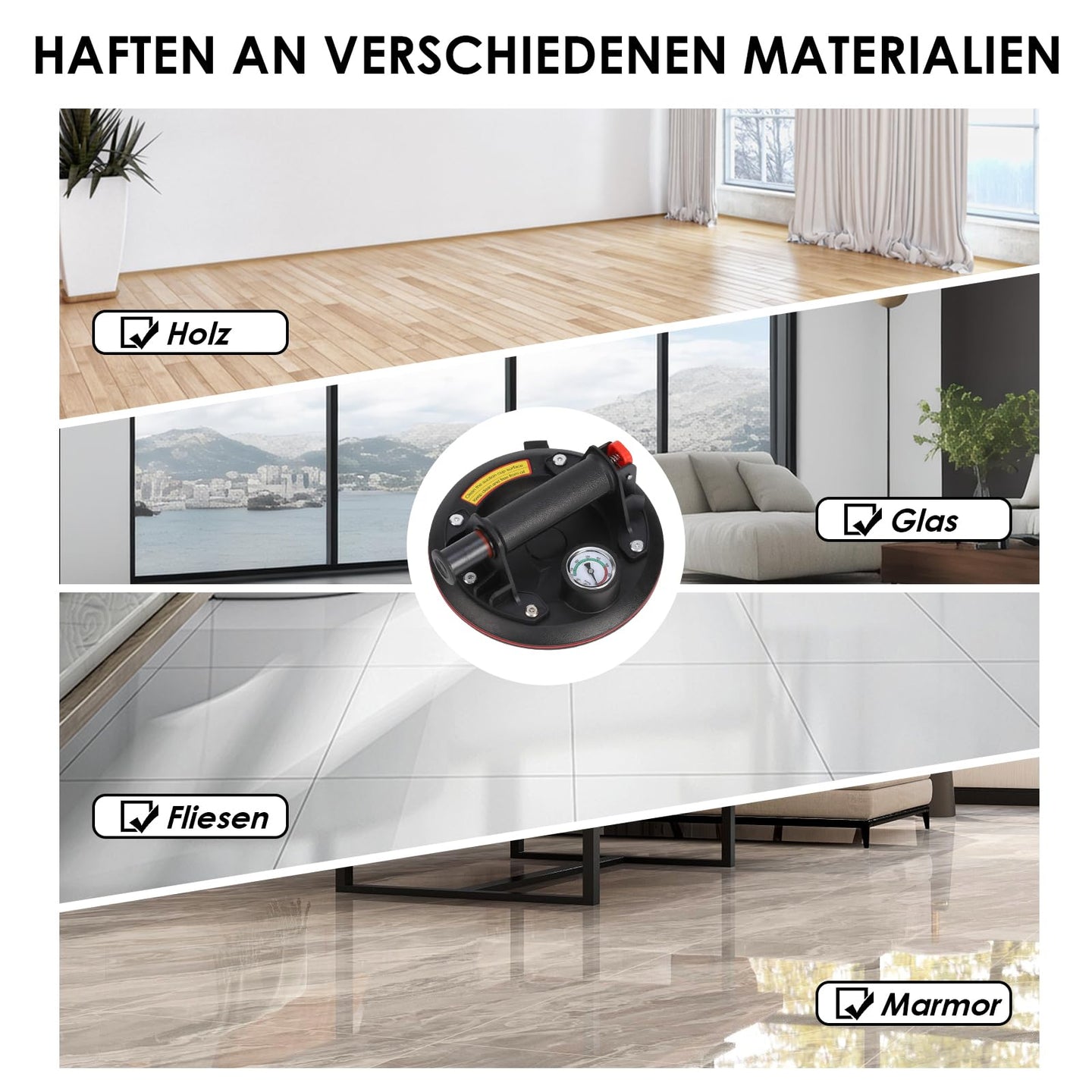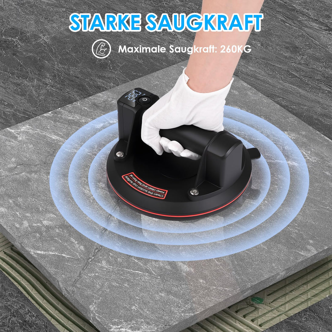 - VIELSEITIG EINSETZBAR: Greifen Sie mühelos Fliesen, Glas, Marmor und vieles mehr! Unser robuster Saugnapf haftet sicher an verschiedensten Materialien und ist damit das ideale Werkzeug für Arbeiten zu Hause, in der Werkstatt oder auf der Baustelle
