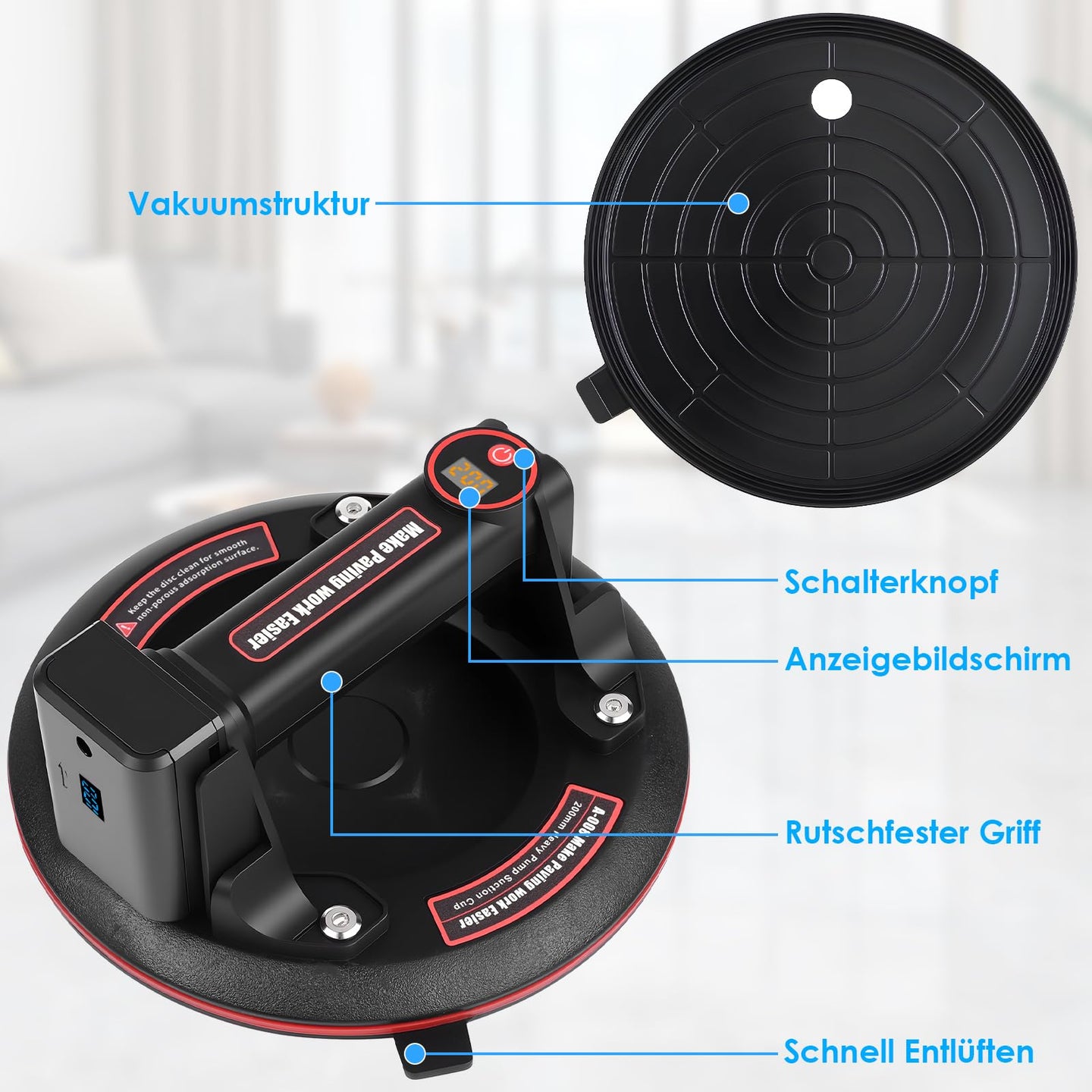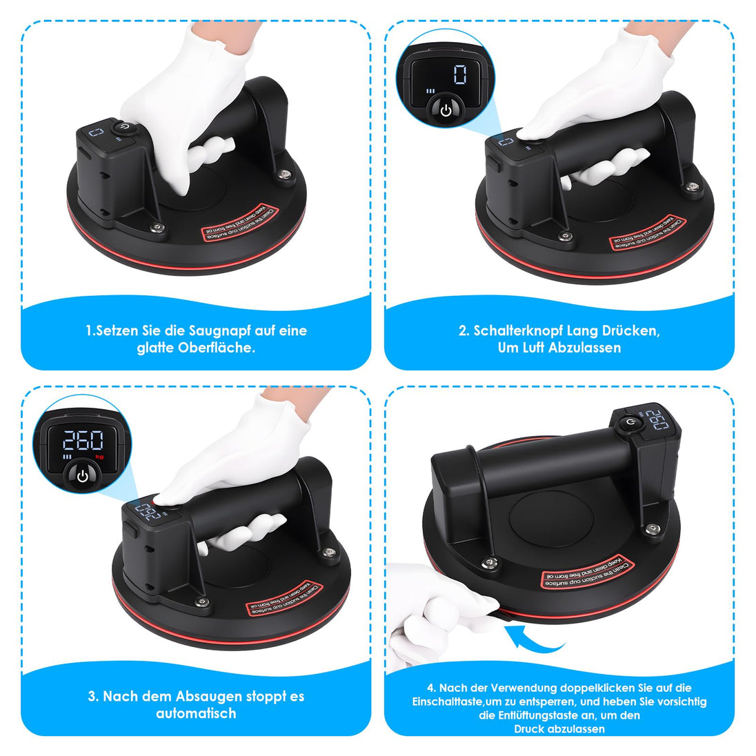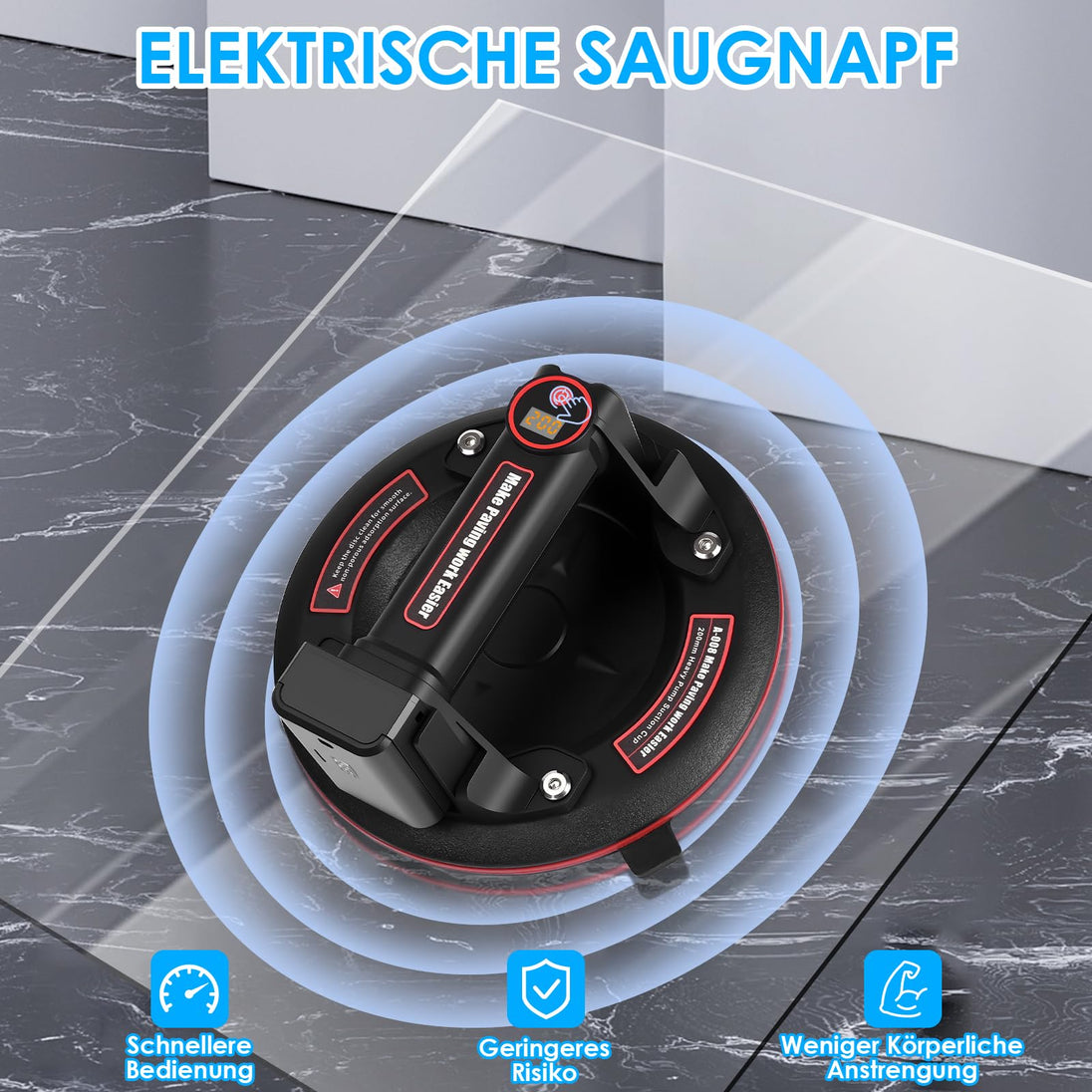 Vergessen Sie manuelle Pumpen oder anstrengende Handwerkzeuge. Unser elektrischer Saugnapf erleichtert anspruchsvolle Arbeiten, reduziert Ermüdung und steigert Ihre Arbeitseffizienz.