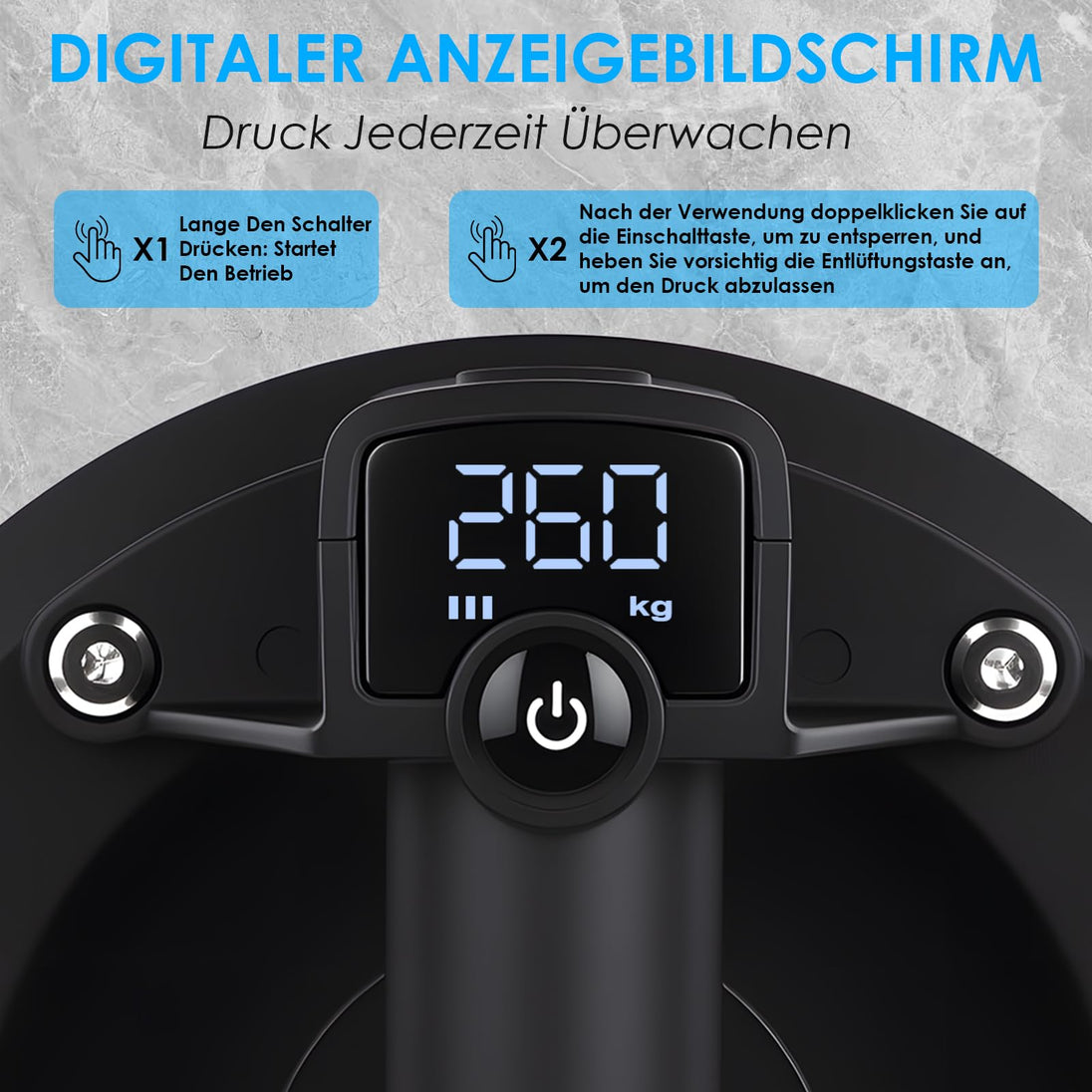 - PRÄZISE KONTROLLE: Das übersichtliche digitale Druckdisplay ermöglicht es Ihnen, die Saugkraft in Echtzeit zu überwachen, um bei jeder Anwendung optimalen Halt zu gewährleisten und absolute Sicherheit gegen Abrutschen zu bieten. Platzieren Sie den Saugnapf einfach auf einer glatten Oberfläche, drücken und halten Sie die Taste, bis das Display 200KG anzeigt, um die Saugwirkung abzuschließen. Nach dem Gebrauch doppelklicken Sie die Taste, um die Luft automatisch abzulassen