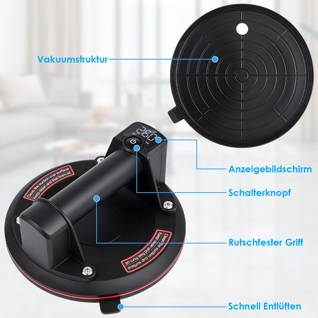 Behalten Sie mit dem integrierten digitalen Druckdisplay stets die volle Kontrolle. Es zeigt Ihnen präzise den aktuellen Unterdruck an, sodass Sie die Saugkraft genau einstellen können – für sicheren Halt, ohne empfindliche Oberflächen zu beschädigen. Egal, ob Sie leichte Materialien oder schwere Glasplatten bewegen: Sie wissen immer genau, wie viel Kraft Sie aufwenden.