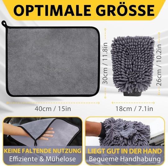 Autopflegeset mit 3 Mikrofasertüchern Auto & 2 Mikrofaser-Waschhandschuhe, 600 GSM zum Trocknen und Polieren, extra saugfähig und sanft weich, 40 x 30 cm