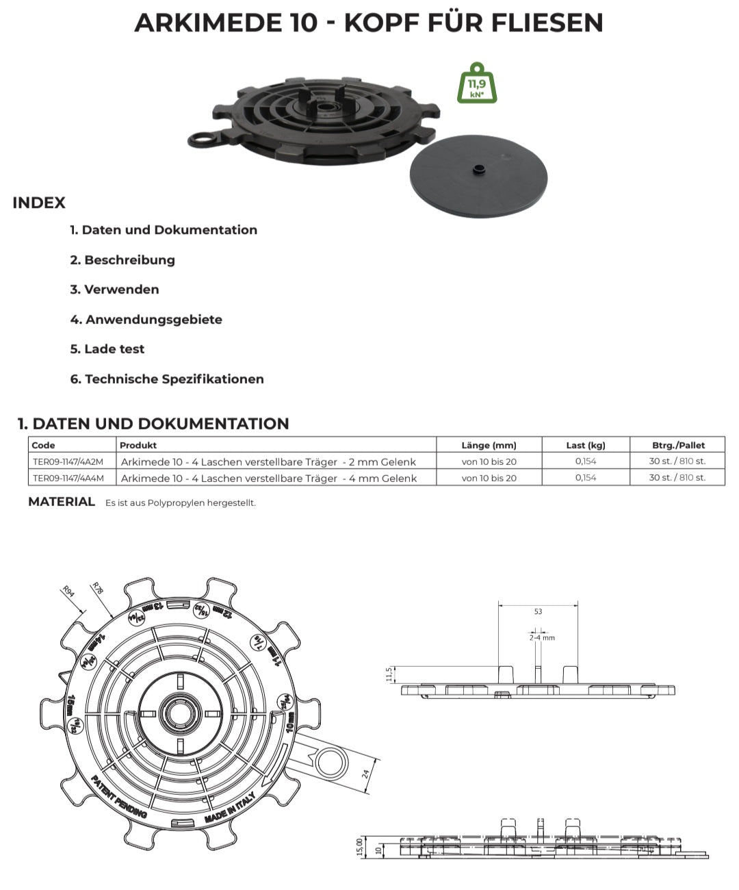 Der teleskopische Träger Arkimede 10 Kopf für Fliesen mit Höhenverstellung von minimal 10 mm bis max. 20 mm. Der Kopf und die Grundlage haben einen Durchmesser von 156 mm und eine Auflagefläche von 191 cm2.