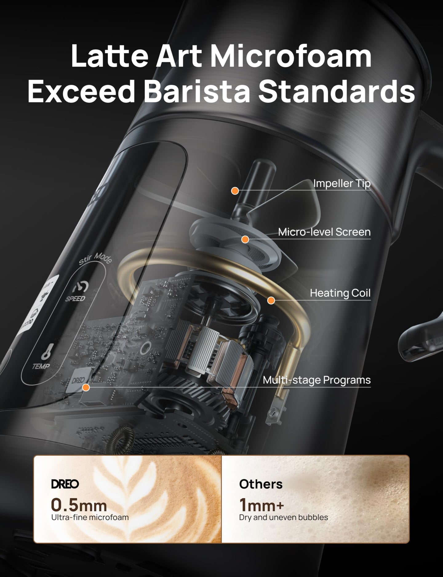 • Reichhaltiger, geschmackvoller Milchschaum: Erleben Sie ein neues Geschmacksniveau dank der Mehrstufentechnologie von DREO. Sie ahmt die Schritte professioneller Baristas nach, balanciert die Temperatur von 65°C und die Luftmischung, ohne die Milch zu verwässern, was zu einem wunderbaren Geschmackserlebnis führt.
