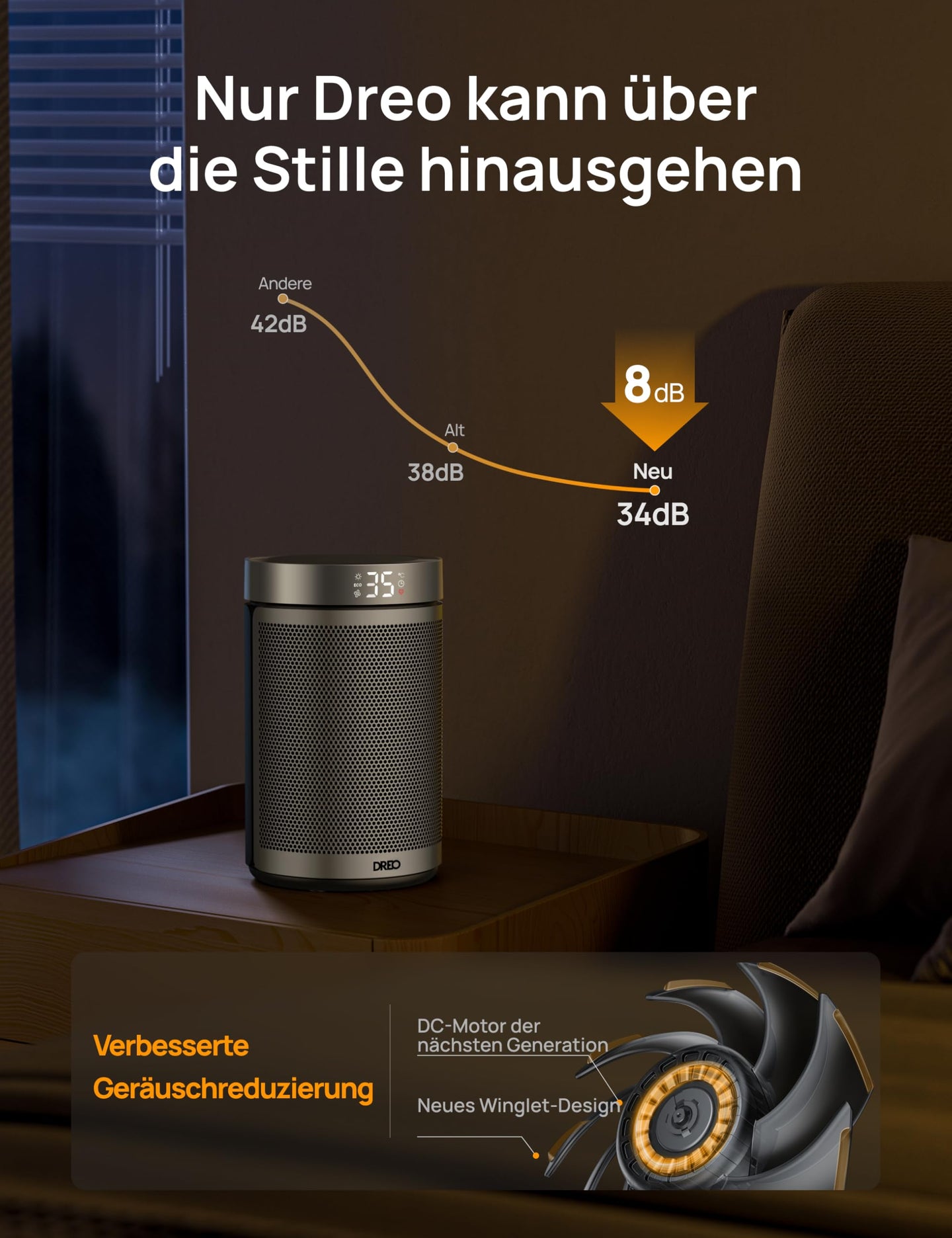 - Gemütliche Stille: Sie müssen sich nicht mehr zwischen Ruhe und Wärme entscheiden. Dreo Heizlüfter für das Schlafzimmer wärmt leise dank seines bürstenlosen Gleichstrommotors mit reibungsfreier Leistung und einem Winglet-Lüfterdesign, das Turbulenzen reduziert und die Geräuschentwicklung auf nur 34 dB senkt.