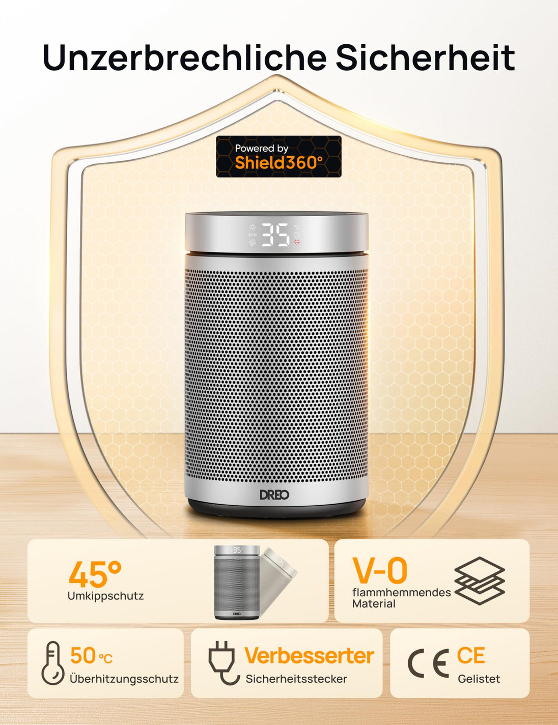 - Unzerbrechliche Sicherheit: Dreo geht über das Unerwartete hinaus, um mit jedem Heizgerät für Sicherheit zu sorgen. Der innovative Neigungserkennungssensor verbessert die Genauigkeit und Zuverlässigkeit für einen besseren Umkippschutz und ist mit flammhemmenden V0-Materialien, Überhitzungsschutz und Sicherheitsstecker ausgestattet.