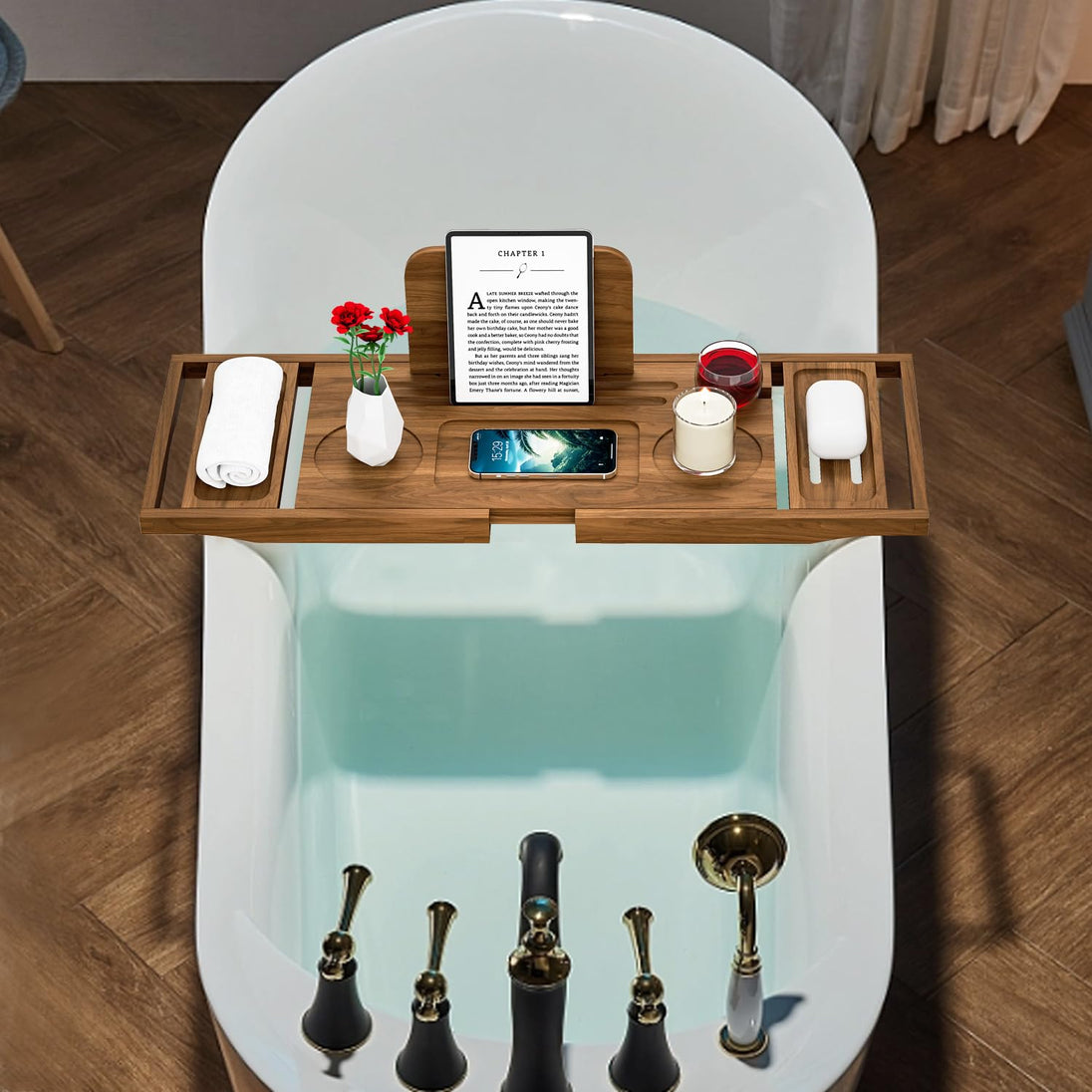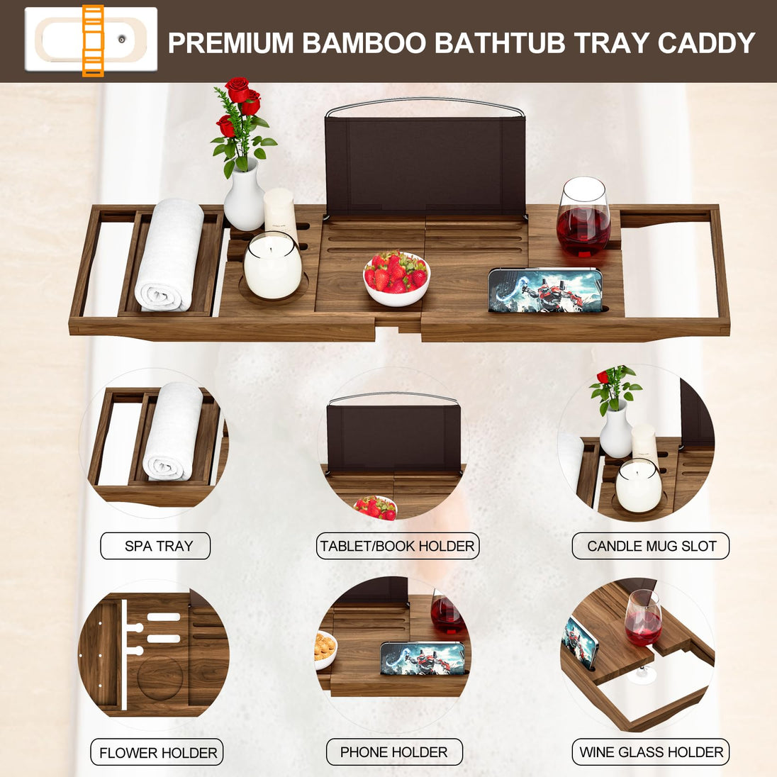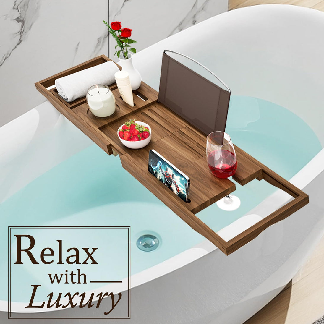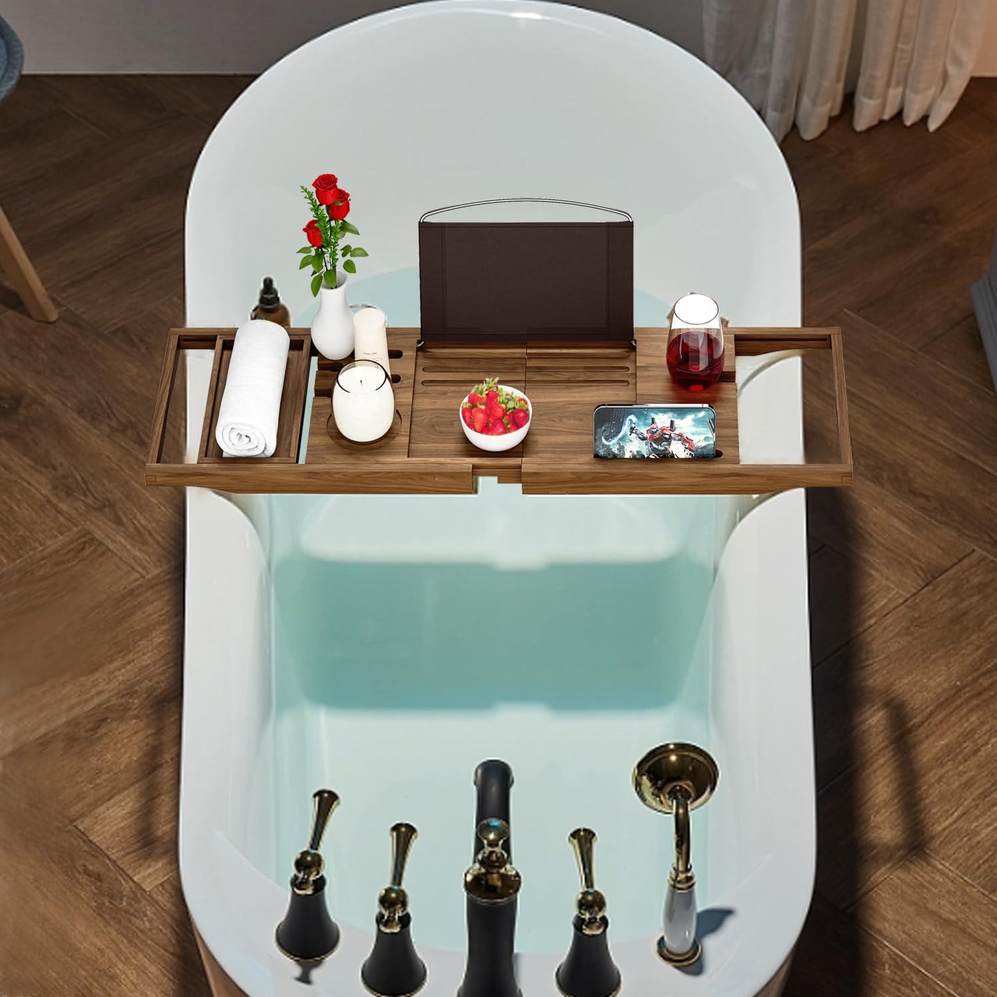 Erweiterbares Bambus-Badewannentablett, verstellbares Badewannenbrett, Badewannenregale, mit Getränkehalter, Buchstütze