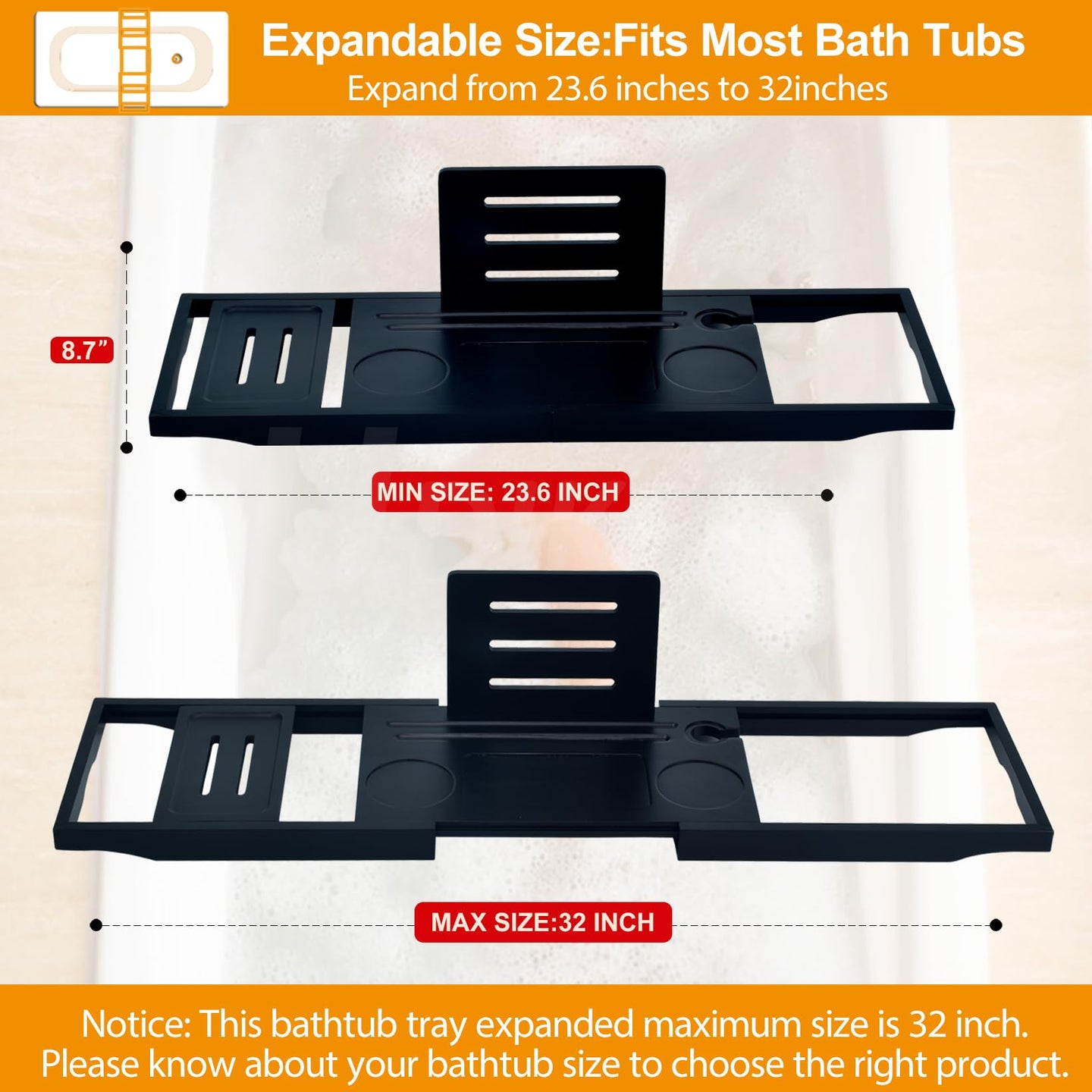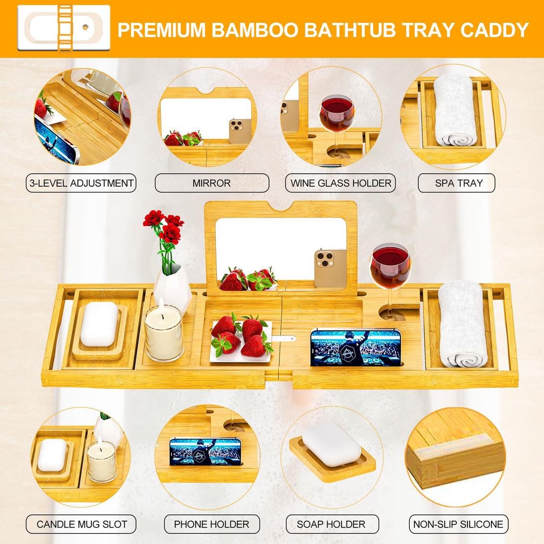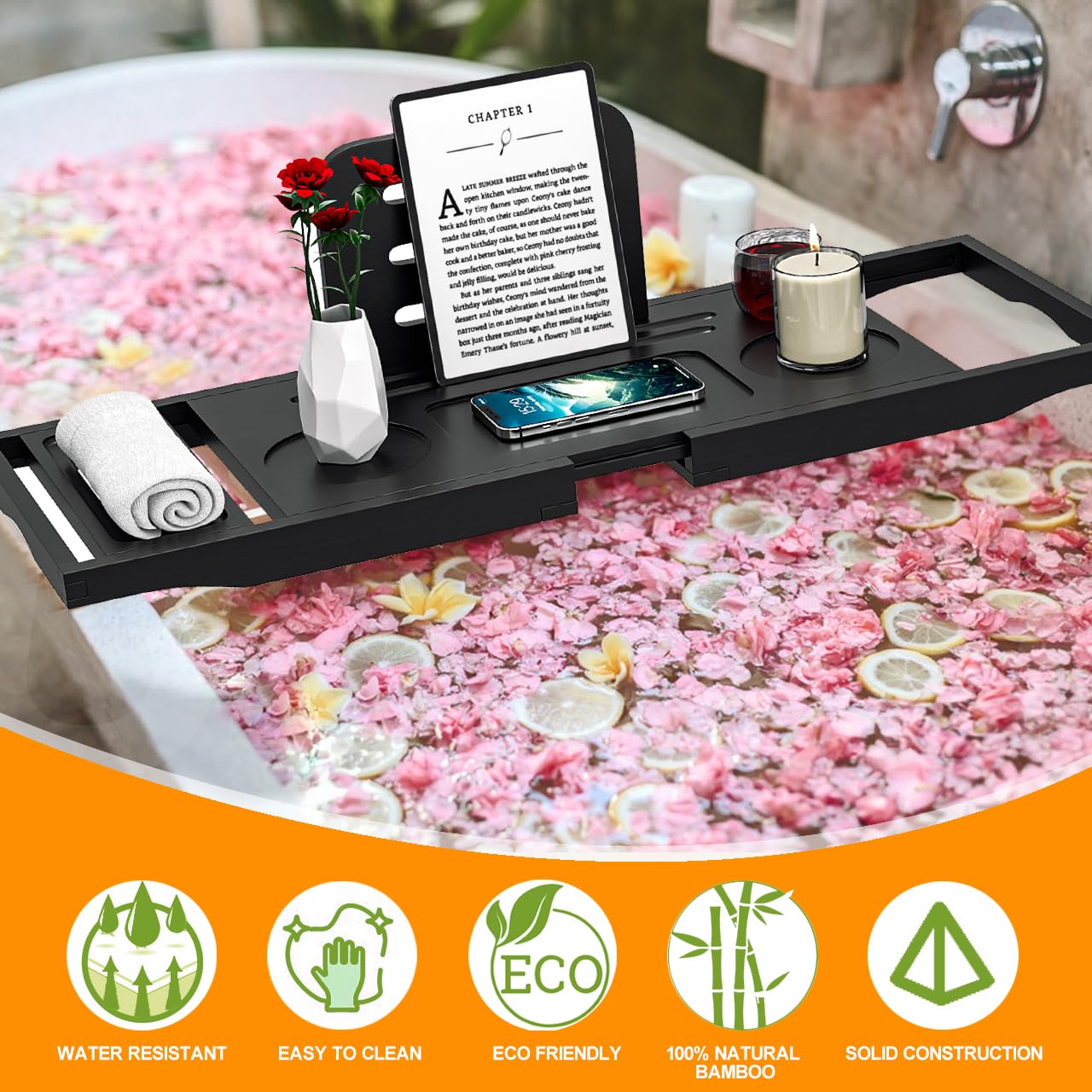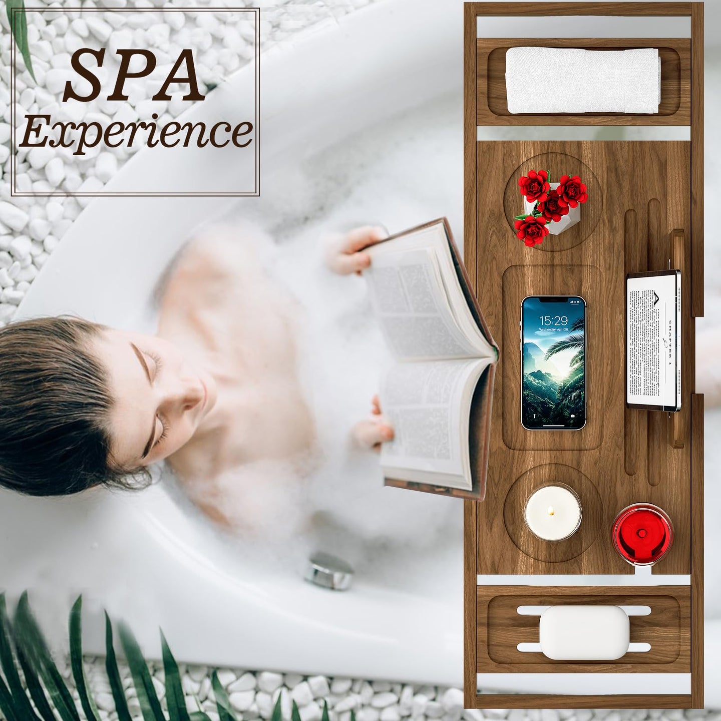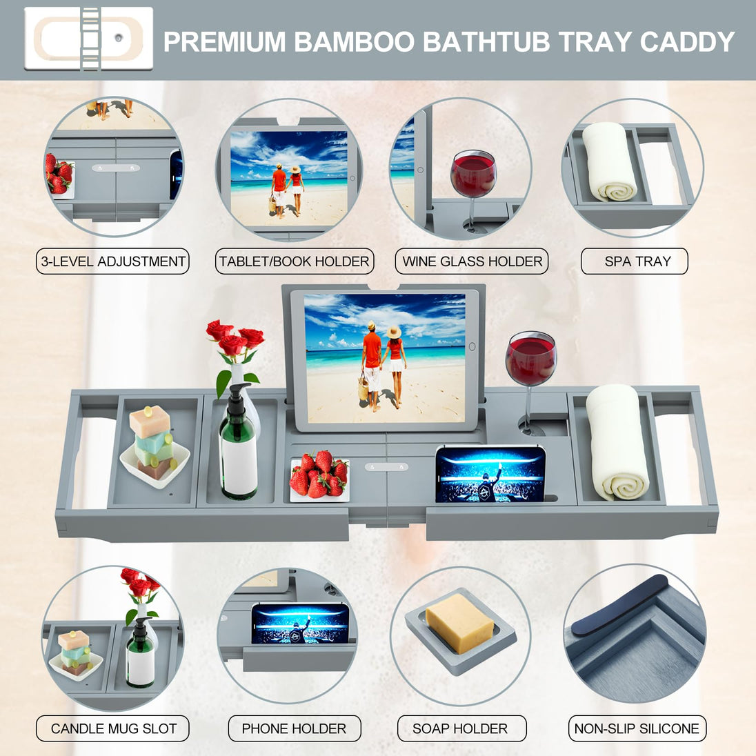 Erweiterbares Bambus-Badewannentablett, verstellbares Badewannenbrett, Badewannenregale, mit Getränkehalter, Buchstütze