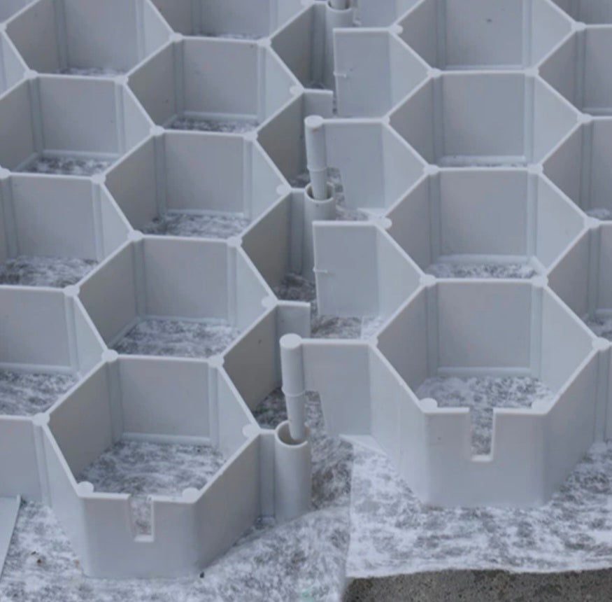 Innovatives ineinandergreifendes System ermöglicht es, die Paneele zu verbinden und eine kontinuierliche Oberfläche zu erzeugen, die einmal unsichtbar wird, sobald er mit Aggregat oder Gras gefüllt ist, wodurch der natürliche Charakter des Gebiets erhalten bleibt.