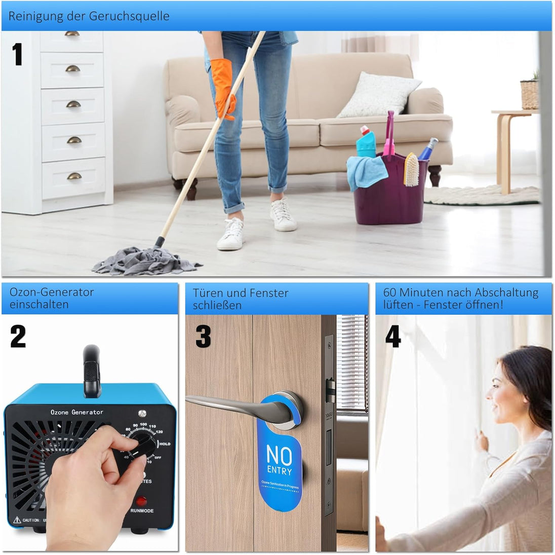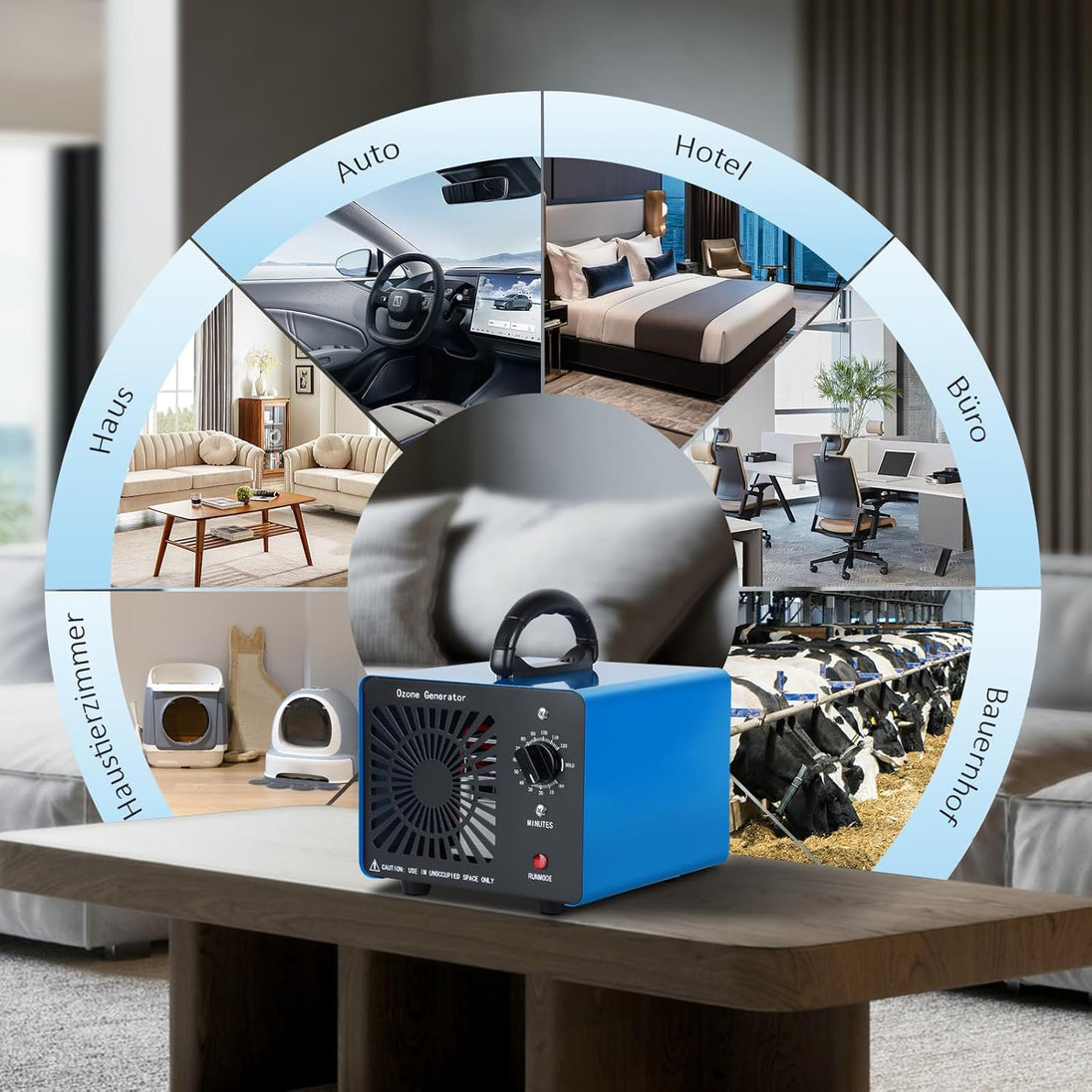 - Warnung: Stellen Sie sicher, dass sich keine Personen oder Tiere im Raum aufhalten, wenn Ozongenerator läuft.Warten Sie nach dem Ausschalten des Ozone generator 30-60 Minuten, bevor Sie eintreten, und öffnen Sie dann die Türen und Fenster zum Lüften.