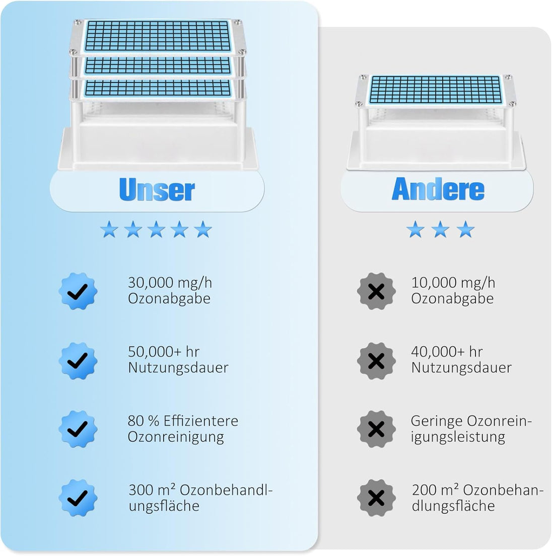 - Hocheffizienter Ozongenerator: Der verbesserte Ozongenerator erzeugt Ozon mit einer Rate von 30000 mg/h, wodurch Gerüche schnell aus der Luft entfernt werden können. Die Reinigungsfläche beträgt bis zu 300 Quadratmeter und die Reinigungseffizienz kann 99% erreichen, wodurch ein angenehmes Wohnumfeld für Sie geschaffen wird.