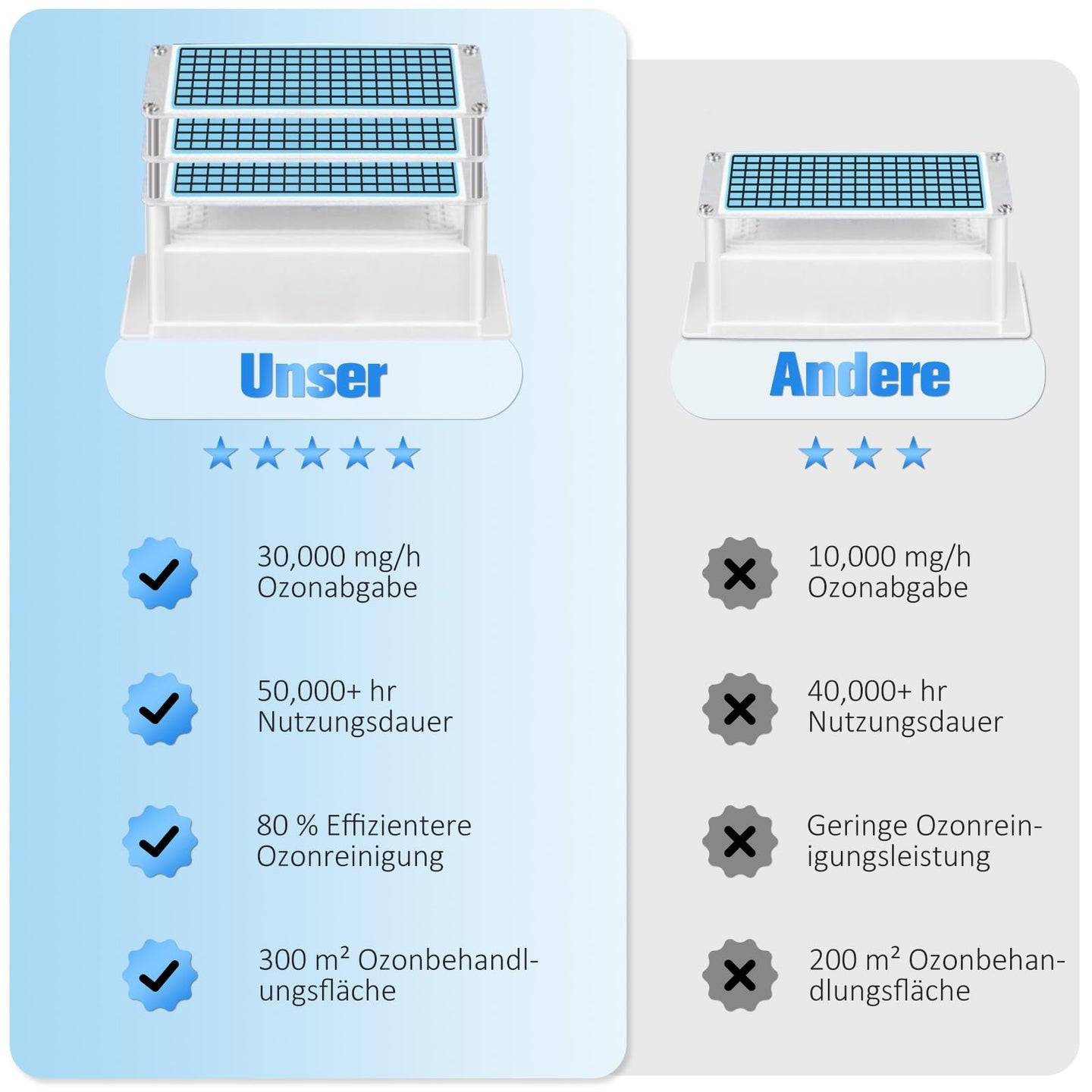 - Hocheffizienter Ozongenerator: Der verbesserte Ozongenerator erzeugt Ozon mit einer Rate von 75000 mg/h, wodurch Gerüche schnell aus der Luft entfernt werden können. Die Reinigungsfläche beträgt bis zu 400 Quadratmeter und die Reinigungseffizienz kann 99% erreichen, wodurch ein angenehmes Wohnumfeld für Sie geschaffen wird.