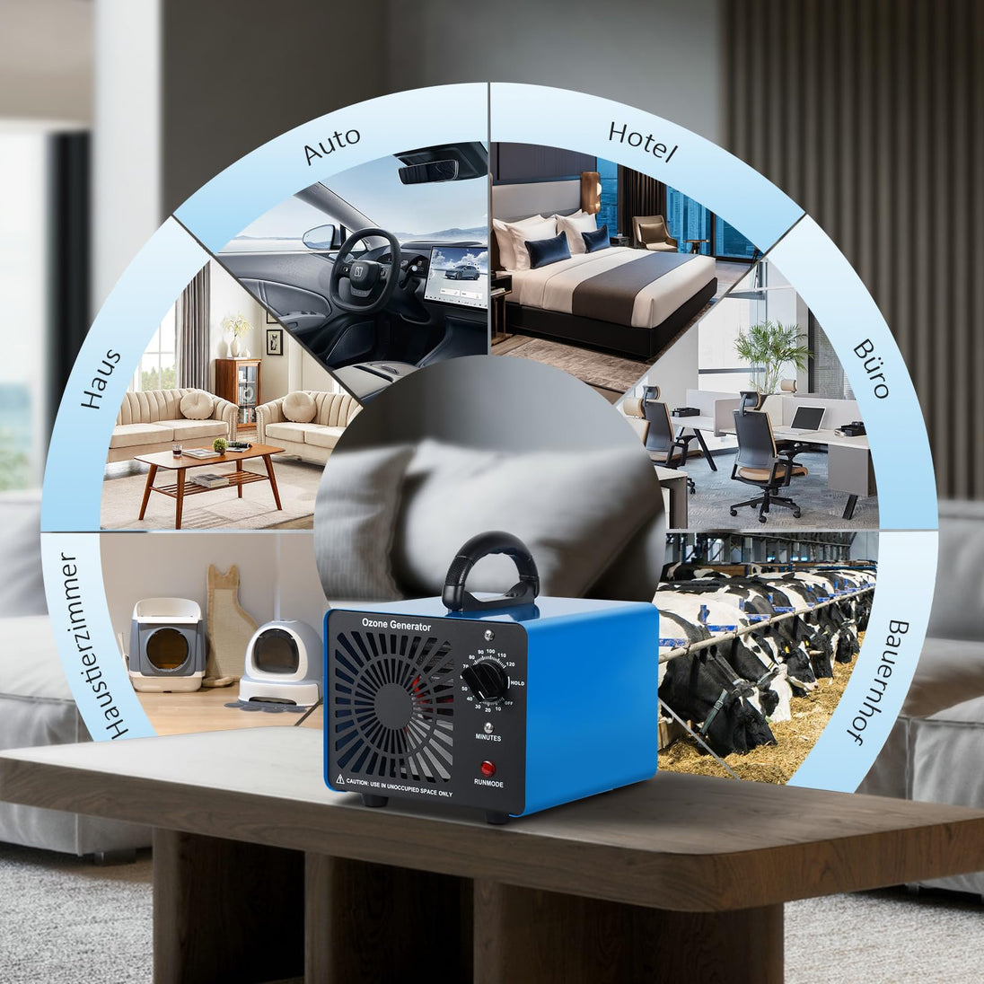 - Leistungsstarker Desodorierer: Der Ozongerät ist mit einem 120-Minuten-Timer ausgestattet, der je nach Flächengröße und Luftqualität eingestellt werden kann. Nicht nur für kleinere Räume wie Autos, Haustierbereiche, Raucherbereiche, Küchen und Schlafzimmer geeignet, sondern auch für größere Räume wie Keller, Wohnungen, Garagen, Büros und Hotels.